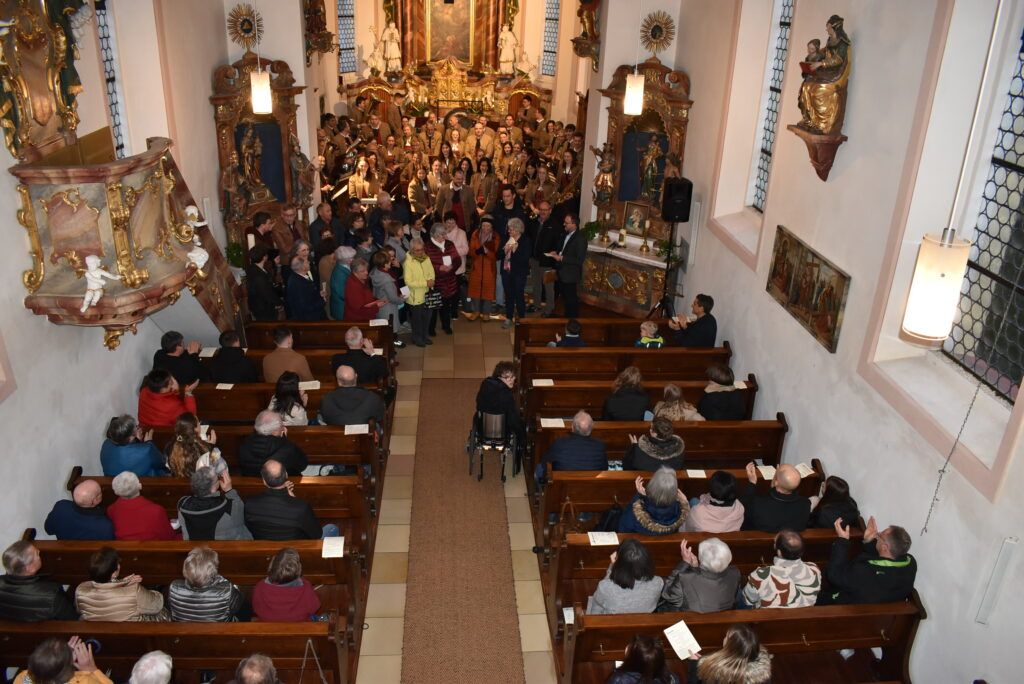 Die Musikkapelle eröffnete im Chorraum mit dem fulminanten und rhythmisch-flotten „Chicago Festival“ und jeder konnte die wunderbare Akustik im Barockjuwel dieser Dorfkirche erleben. Festlicher und etwas ruhiger zeigte sich das Stück „All glory told“ in sehr harmonischen Klangfarben. Der Kirchenchor hatte sich auf der Empore platziert und ließ seine schönen Lieder über die Besucher „herunterfließen“. Organist Markus Heinrich begleitet die Stücke gefühlvoll, die alle zur Ehre Gottes erklangen.