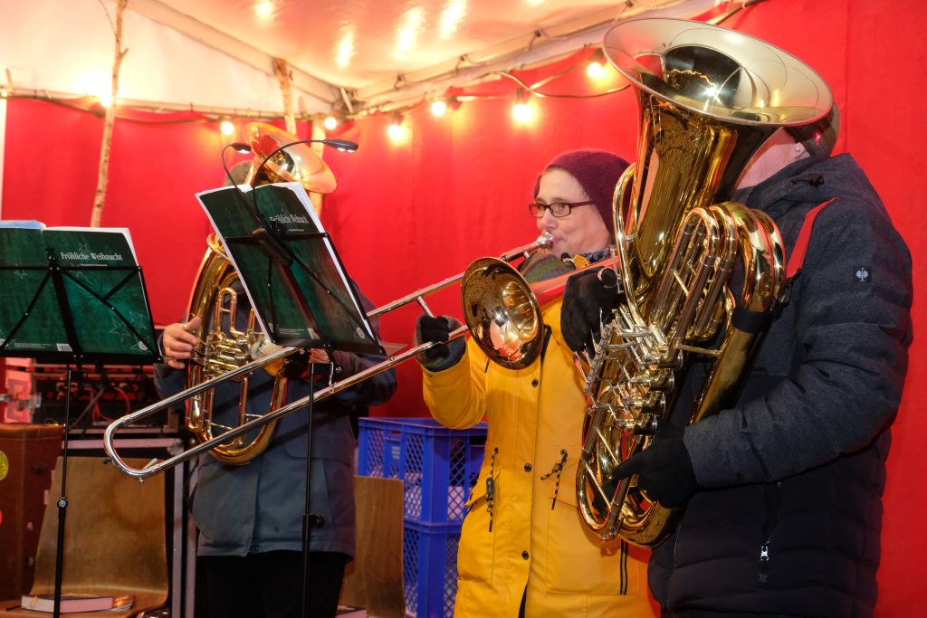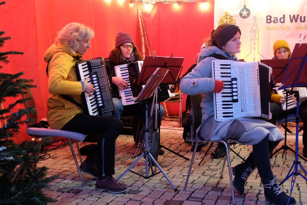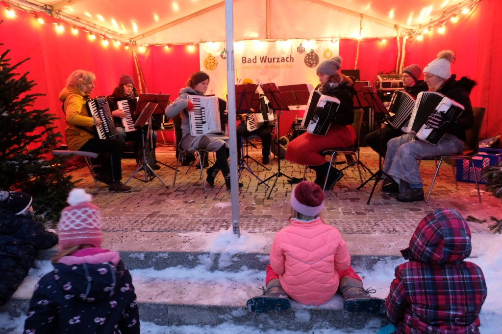 Die großen und kleinen Gäste wurden von der Jugendkapelle Bad Wurzach und dem Vorstufenorchester der Jugendmusikschule unter der Leitung von Petra Springer mit adventlichen und weihnachtlichen Weisen begrüßt. Darauf sind die Organisator/innen des Weihnachtsmarktes besonders stolz: In Bad Wurzach wird live musiziert. Nach den Jugendorchestern hatten noch das Akkordeonorchester unter der Leitung von Dorith Strobel und der evangelische Posaunenchor unter Johannes Wirth an diesem Weihnachtsmarktsamstag einen Auftritt auf der kleinen Bühne an der Kirchentreppe. Den musikalischen Abschluss bildete am Samstag das vom A-Capella-Abend in Ziegelbach bekannte Gesangsquartett „VieraGsang“.