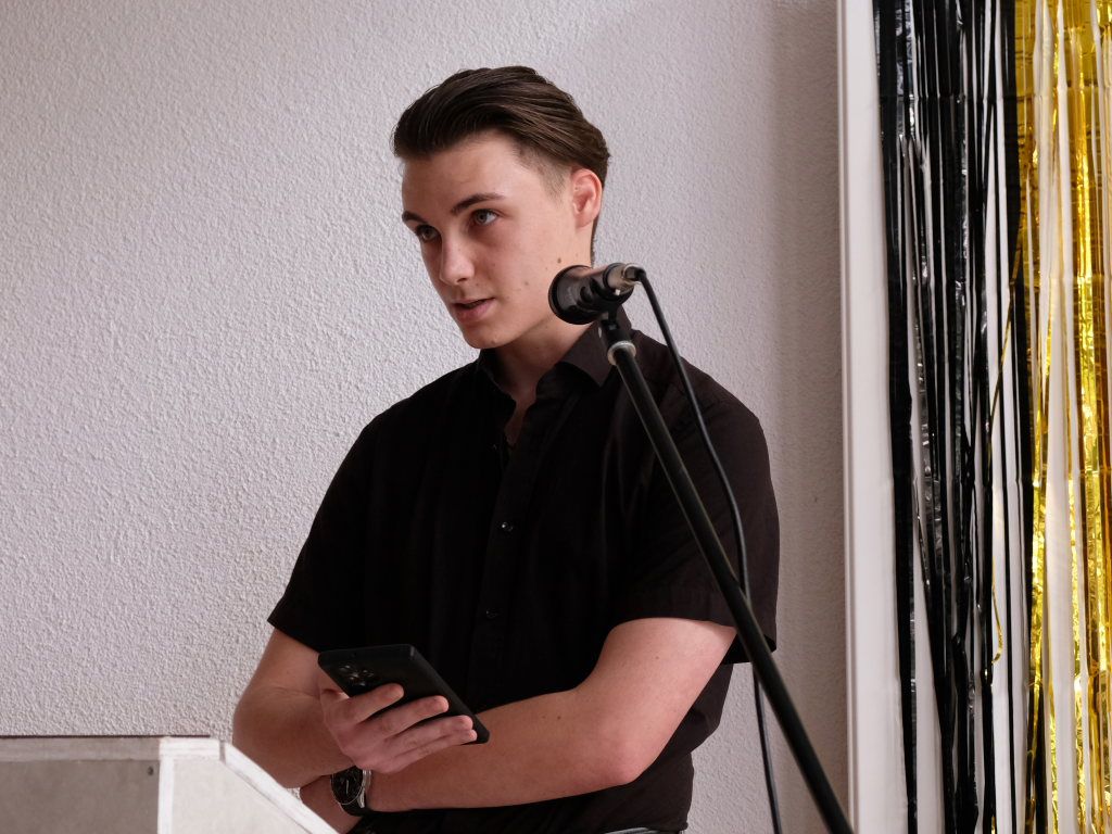 Klassensprecher Michael Schlachter fasste in seiner Ansprache die letzten sechs Jahre zusammen: Sie seien voller Erwartungen gestartet, die Jahre seien anstrengend gewesen, aber „Wir haben Teamwork gelernt.“ In Mathematik hätten sie die Komplexität erkannt, in Deutsch die Angst vor großen Texten verloren, in den Naturwissenschaften hätten sie gelernt: „Chemie ist überall.“ Er dankte den Lehrern und Eltern, „die an unser Potential geglaubt haben.“ Sie nähmen aus dieser Zeit vieles mit. Er endete mit einem Zitat: „Lernen ist wie Schwimmen. Wenn man aufhört, geht es rückwärts.“