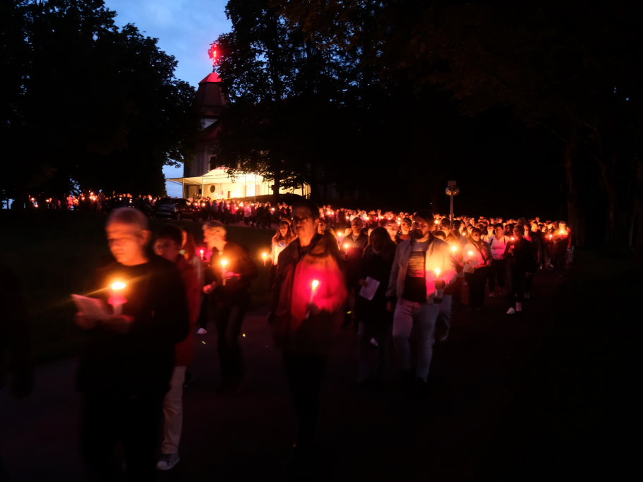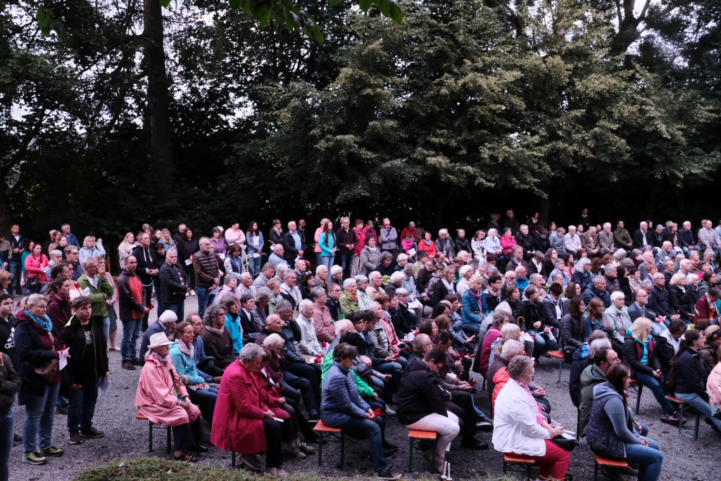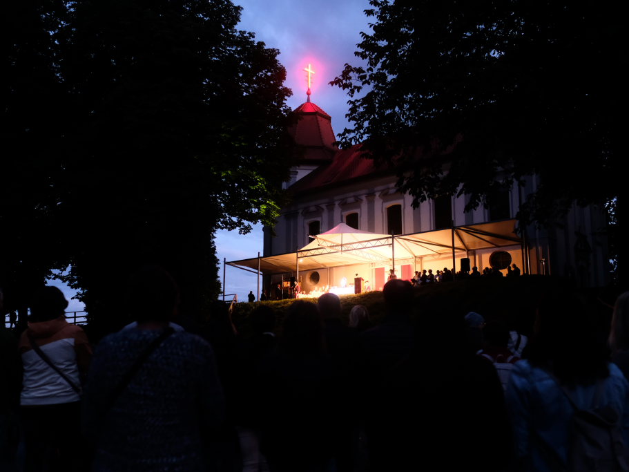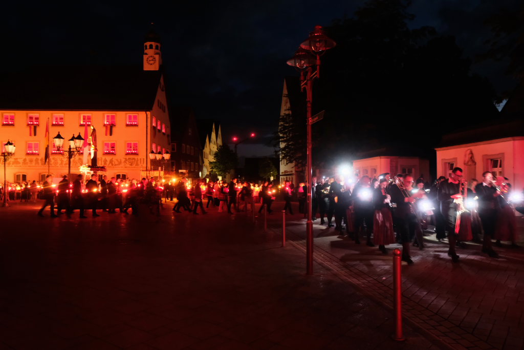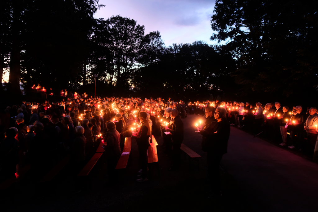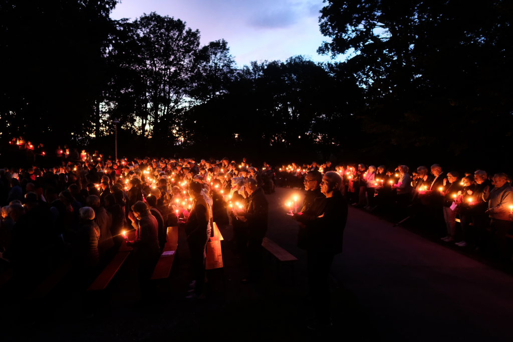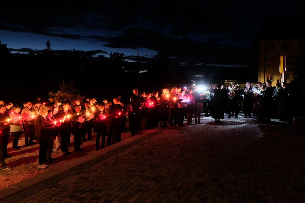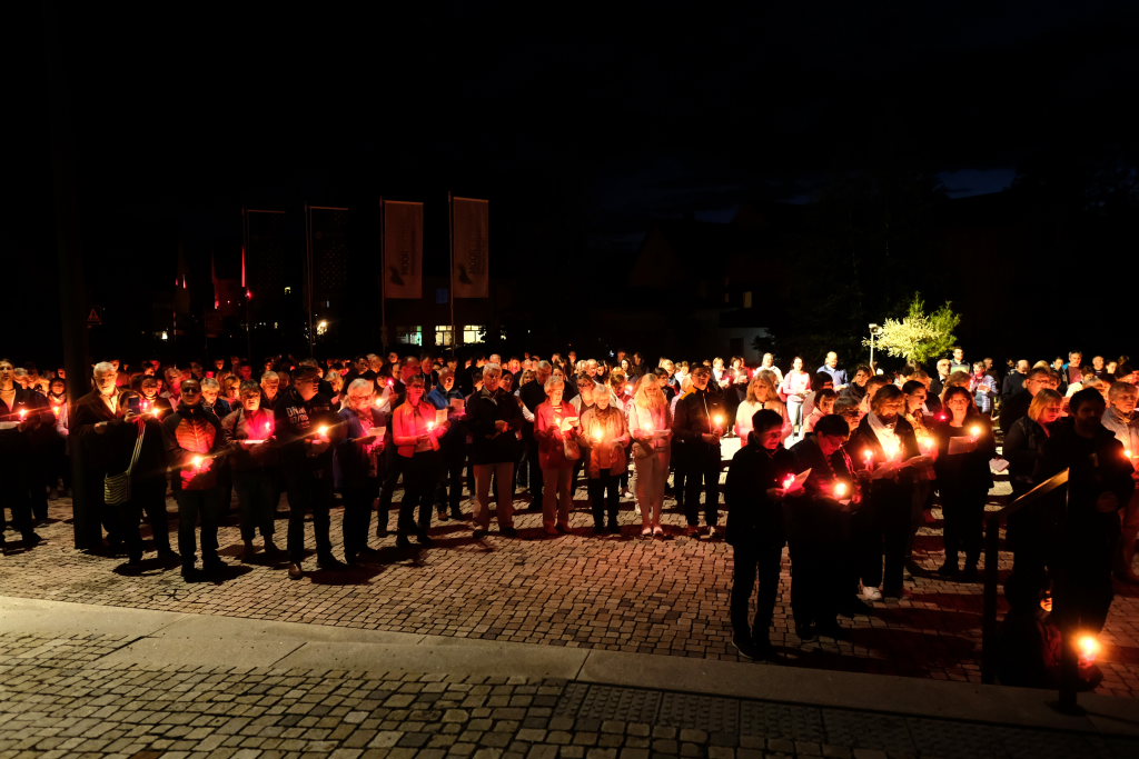 Während die Stadtkapelle das Wurzacher Wallfahrtslied intonierte, wurden von den Gläubigen die mitgebrachten Kerzen entzündet und verwandelten bei der hereinbrechenden Dunkelheit das Auditorium in ein rotleuchtendes Lichtermeer.