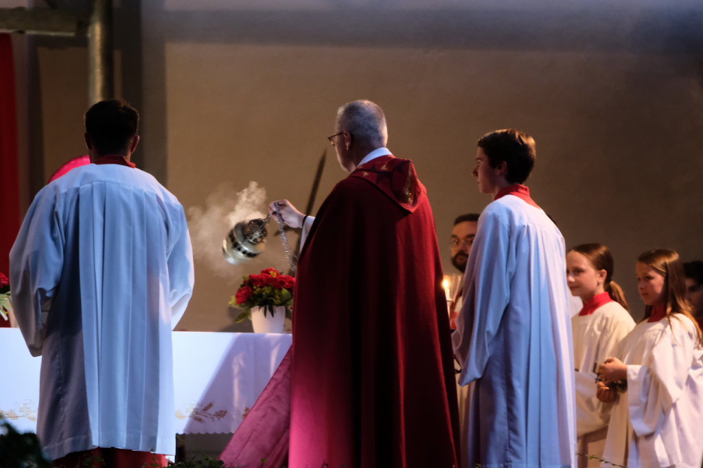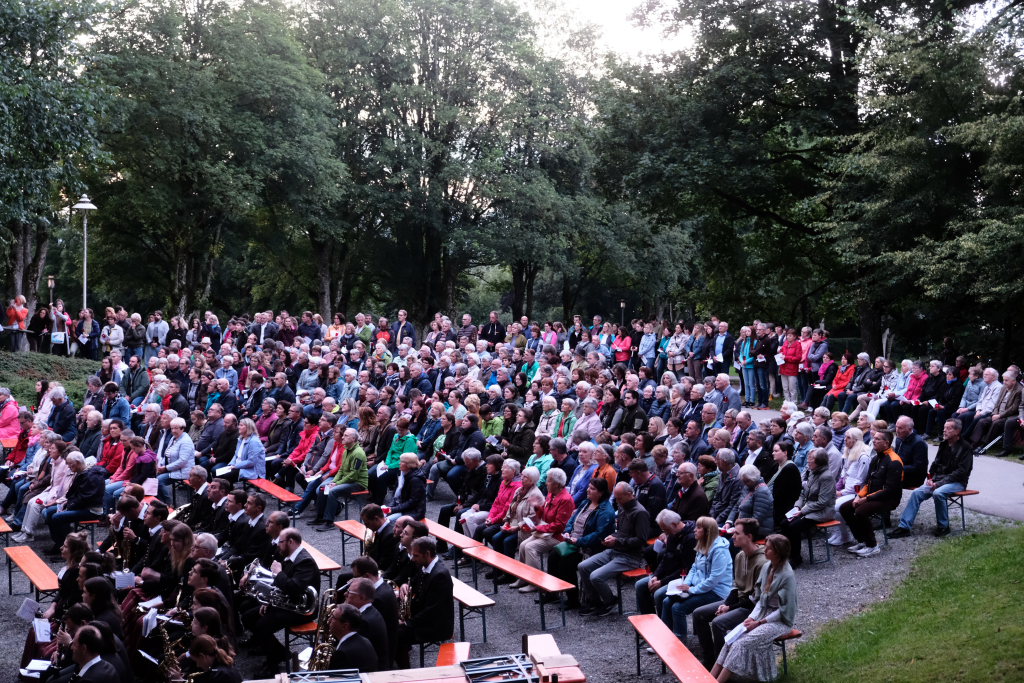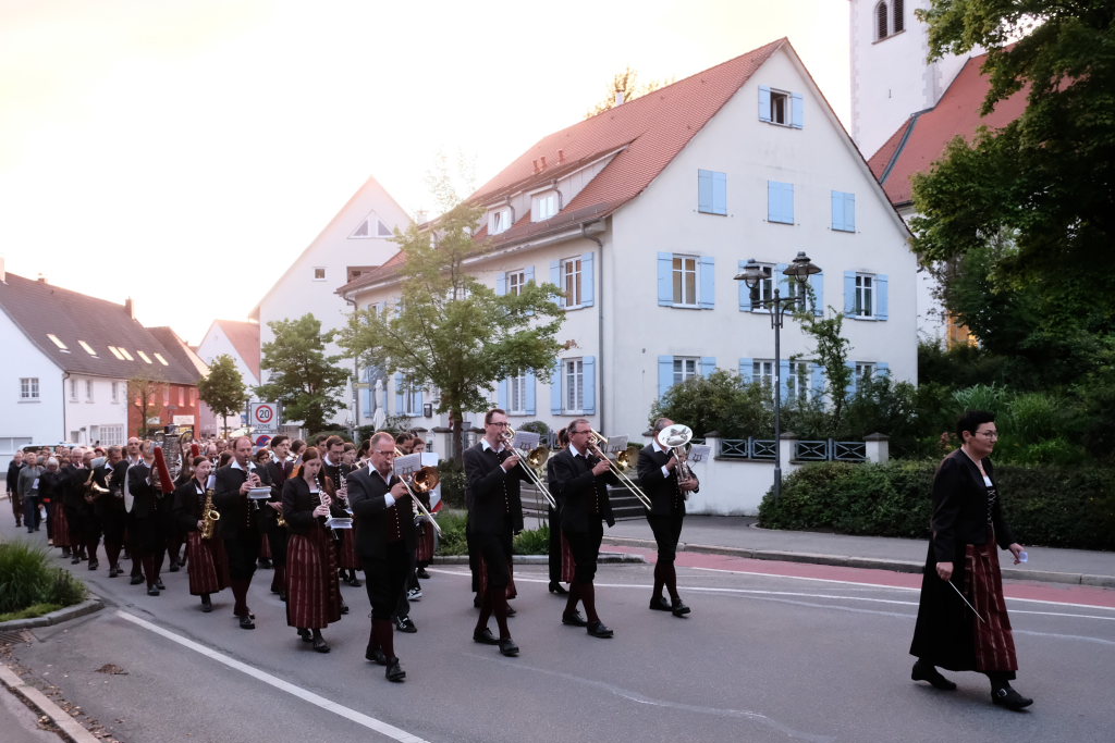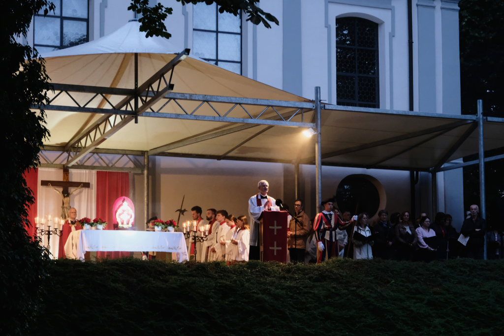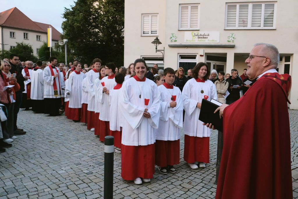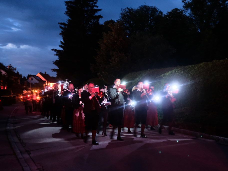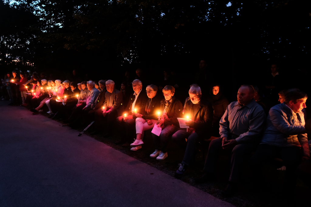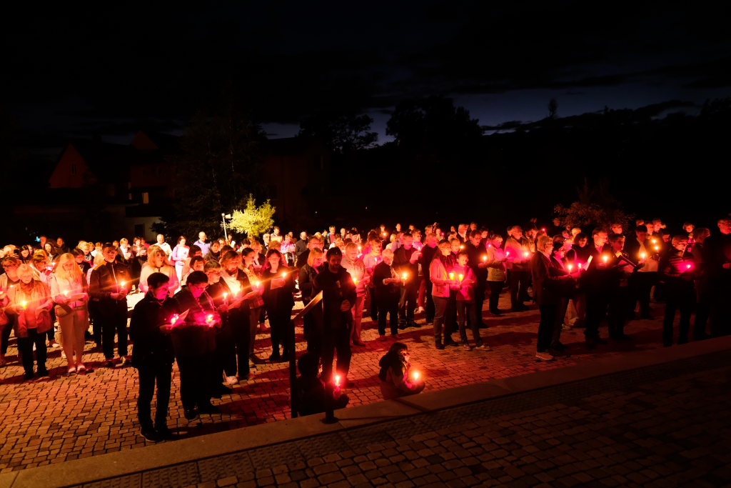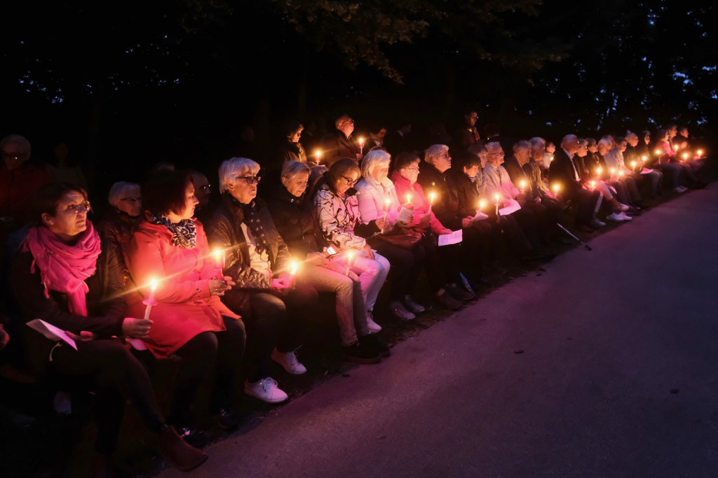 Während die Stadtkapelle das Wurzacher Wallfahrtslied intonierte, wurden von den Gläubigen die mitgebrachten Kerzen entzündet und verwandelten bei der hereinbrechenden Dunkelheit das Auditorium in ein rotleuchtendes Lichtermeer.