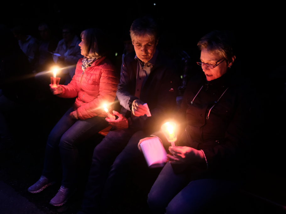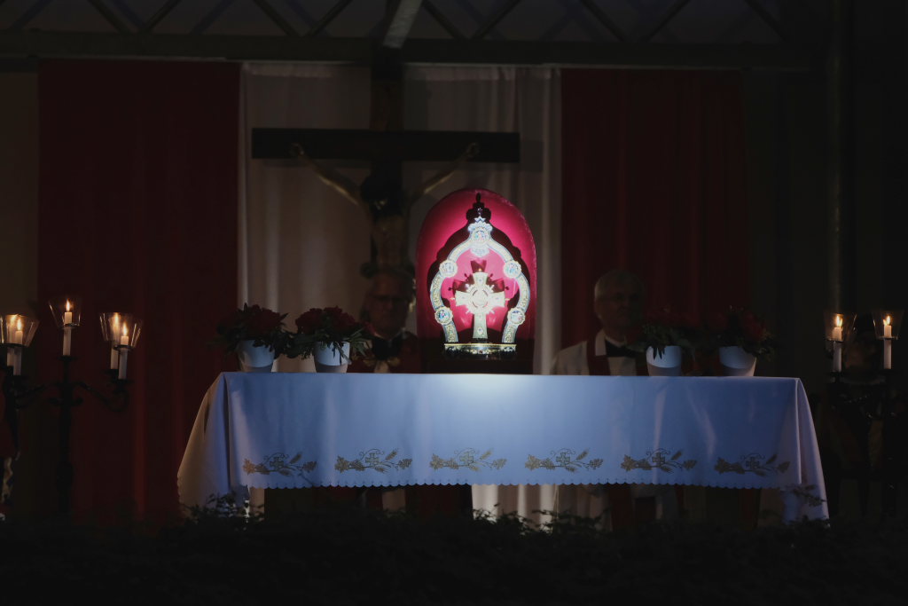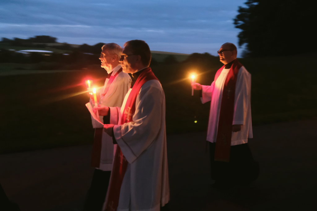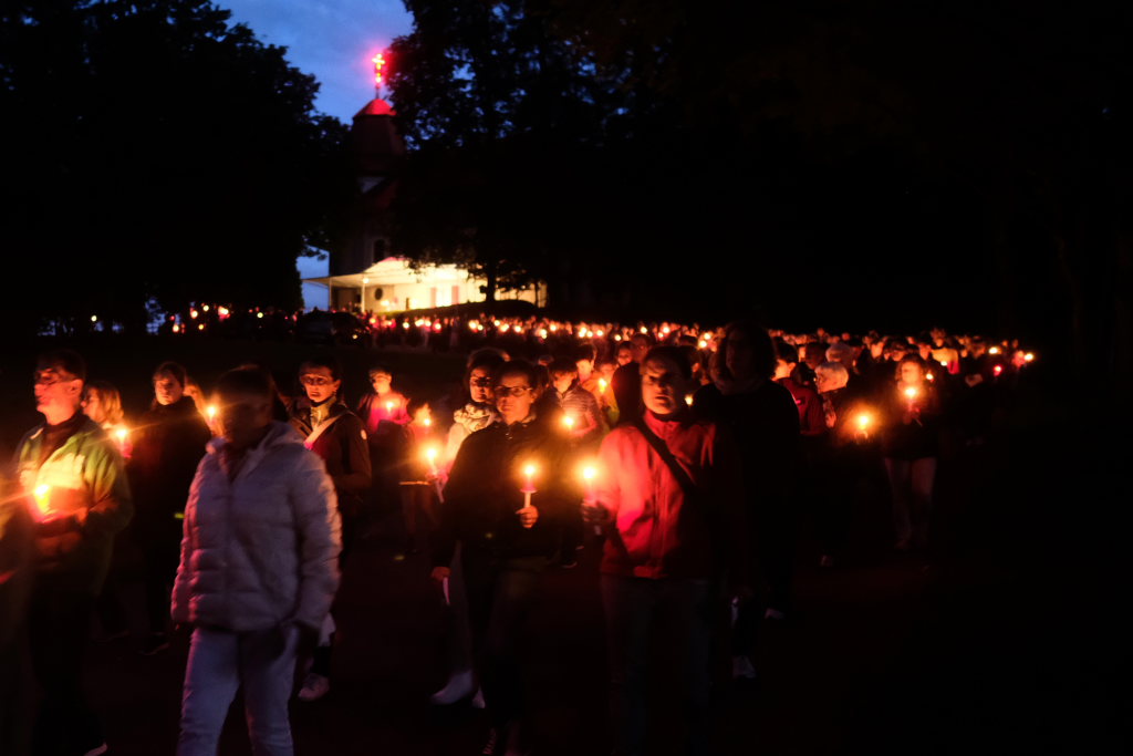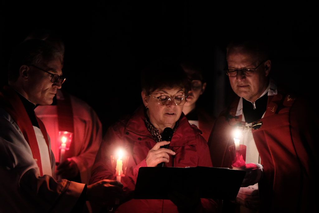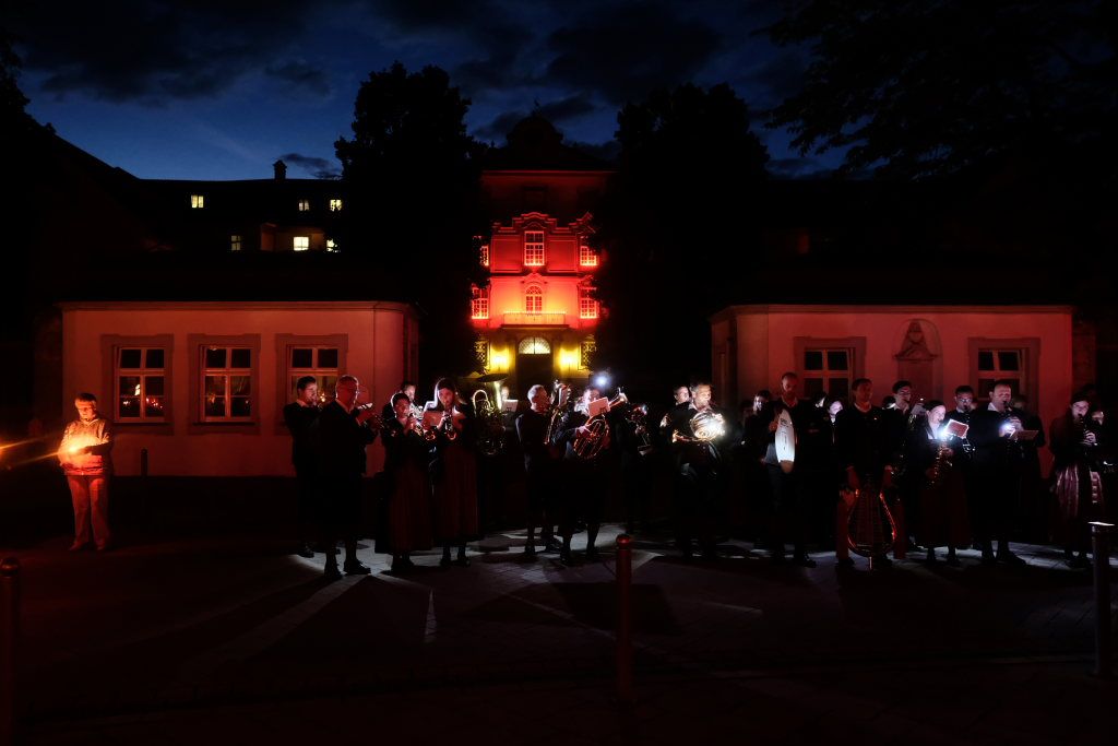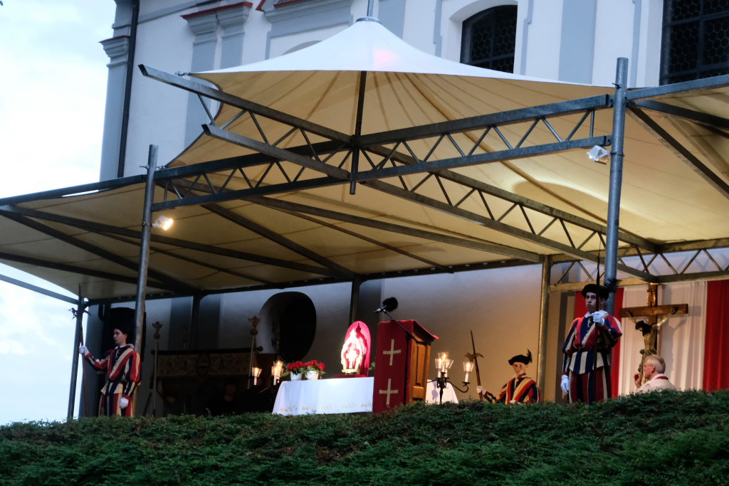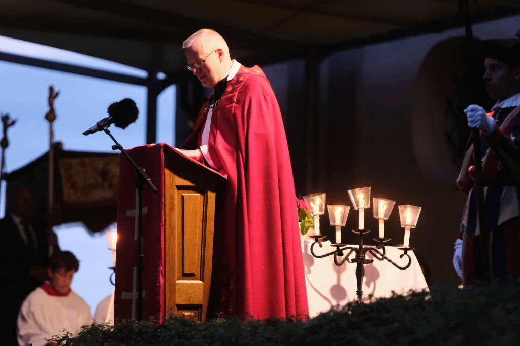 Während die Stadtkapelle das Wurzacher Wallfahrtslied intonierte, wurden von den Gläubigen die mitgebrachten Kerzen entzündet und verwandelten bei der hereinbrechenden Dunkelheit das Auditorium in ein rotleuchtendes Lichtermeer.