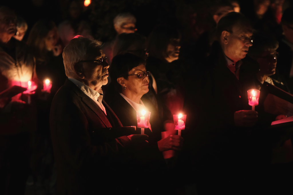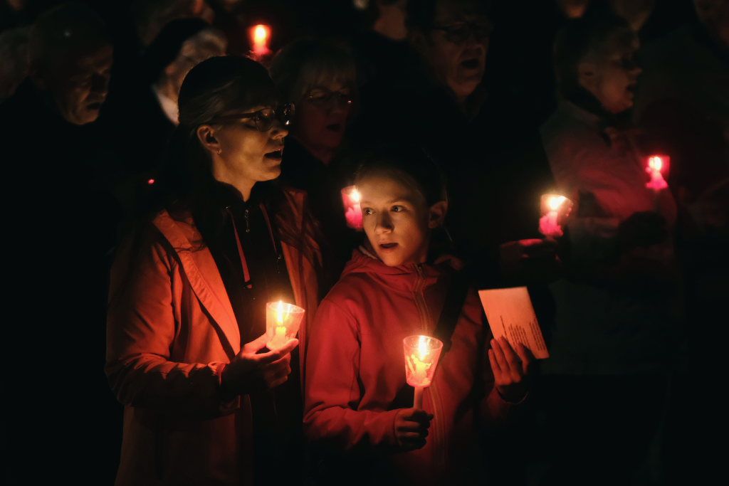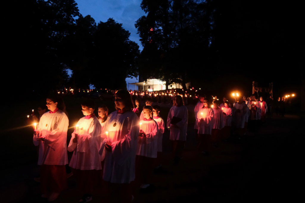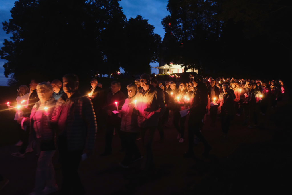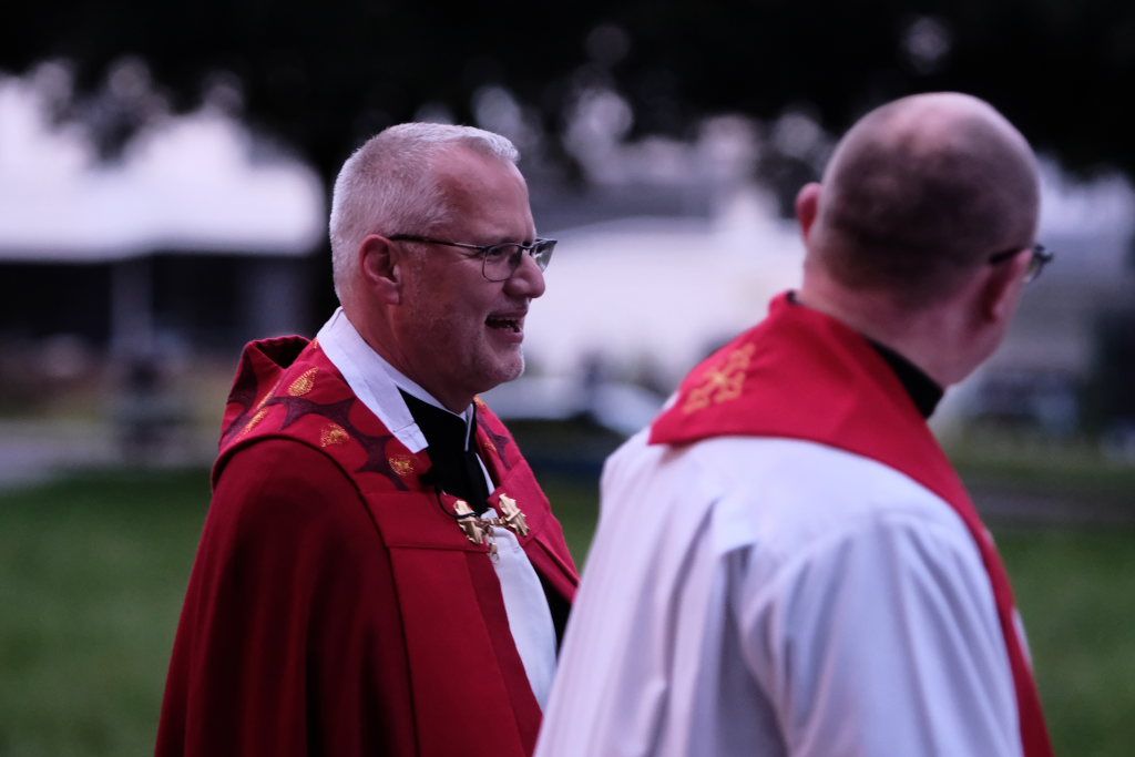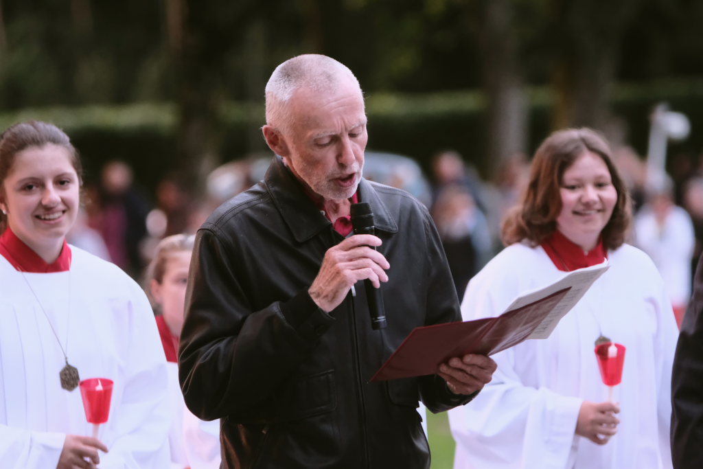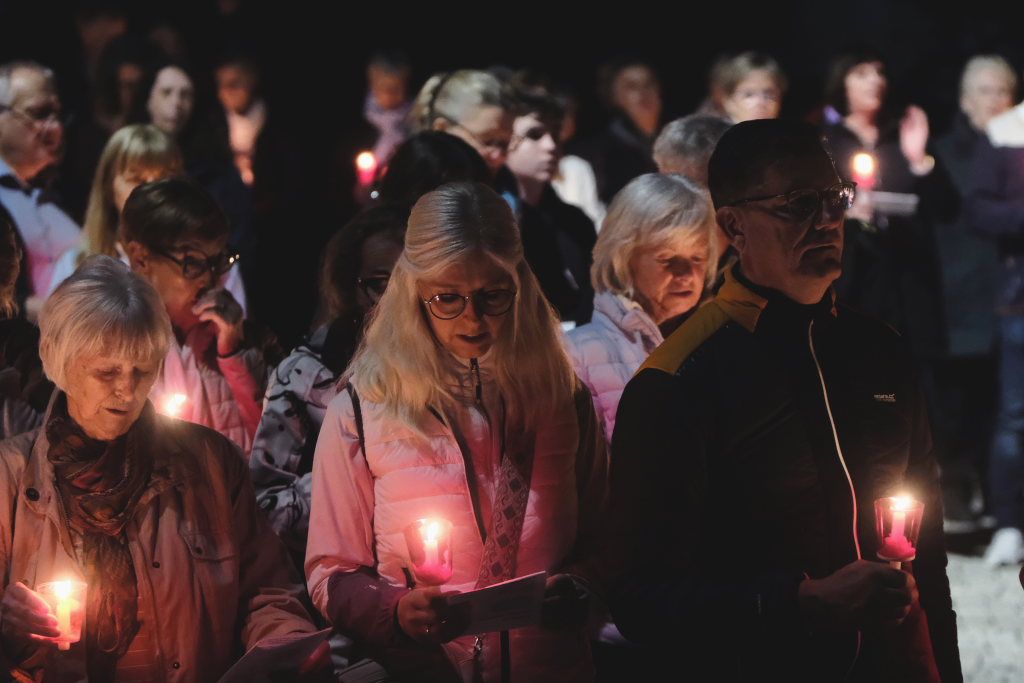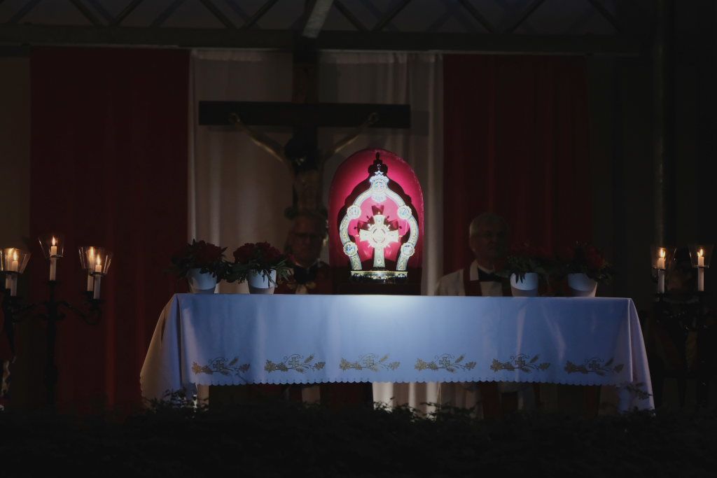 Während die Stadtkapelle das Wurzacher Wallfahrtslied intonierte, wurden von den Gläubigen die mitgebrachten Kerzen entzündet und verwandelten bei der hereinbrechenden Dunkelheit das Auditorium in ein rotleuchtendes Lichtermeer.