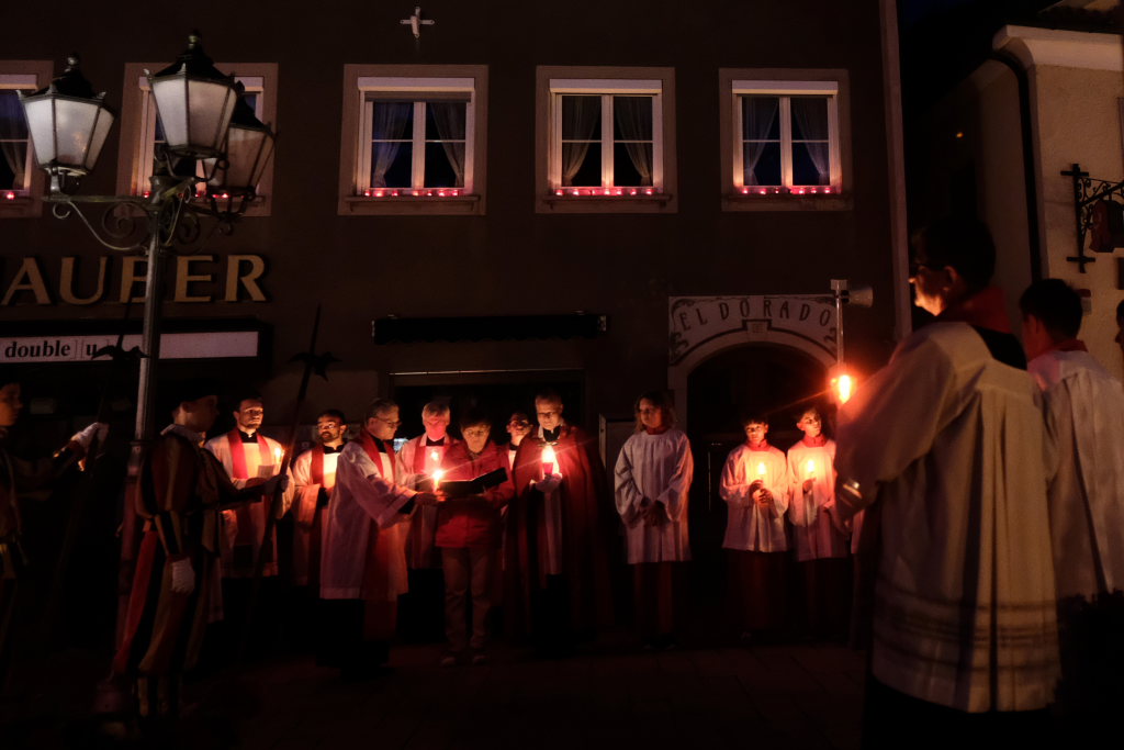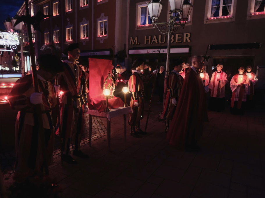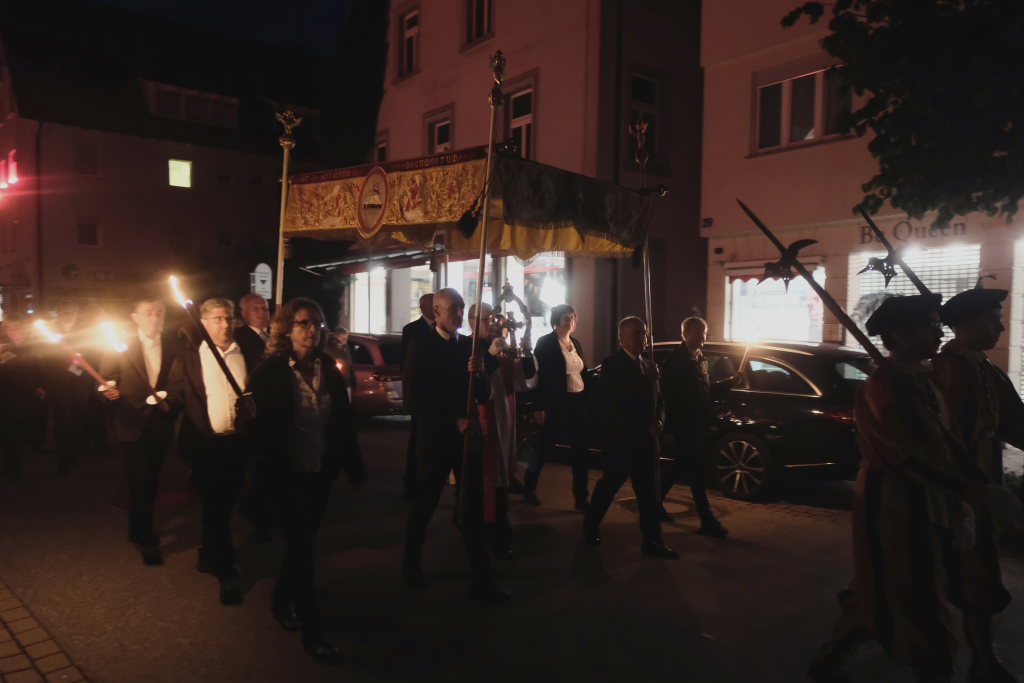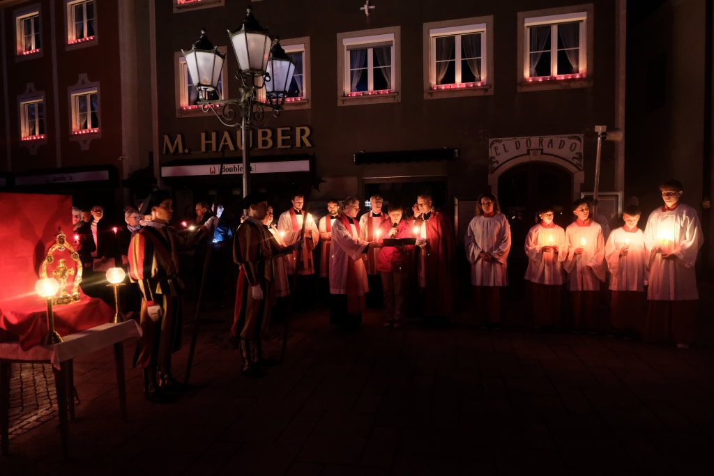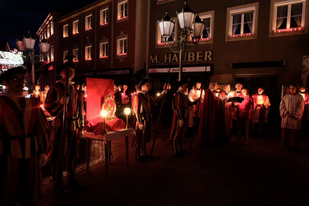 Pfarrer Maier trug die Reliquienmonstranz unter dem reichverzierten “Himmel” hinab in die Stadt, vorbei an auffallend vielen geschmückten und beleuchteten Häusern. Auch Schloss, Rathaus und Amtshaus waren illuminiert. Am Marienbrunnen verlas Gemeindereferentin Angelika Schupp die Botschaft zur jungfräulichen Empfängnis Mariens. Von dort bis zum Klosterplatz und zur St. Verena-Kirche übernahm dann Pfarrer Patrick Meschenmoser die Reliquie. Auf dem ganzen Weg wurde gebetet, unter anderem die Allerheiligen-Litanei.