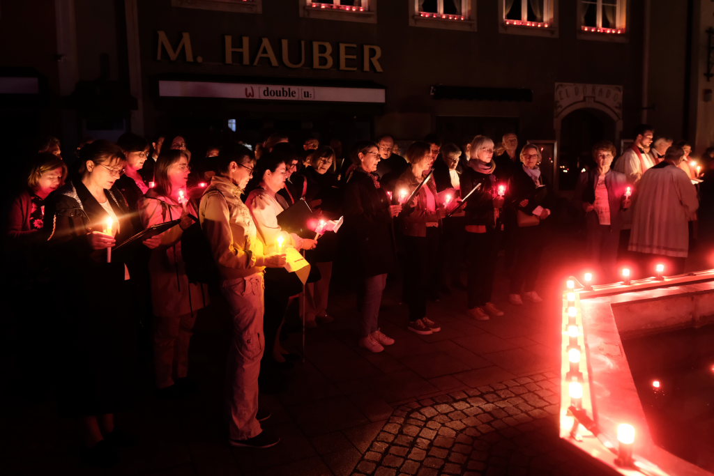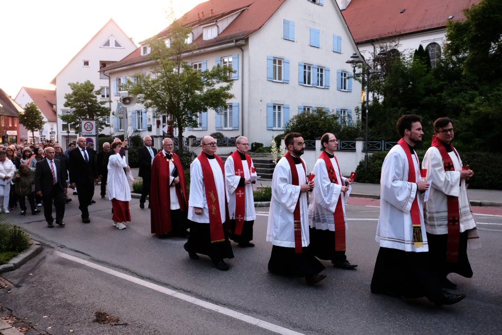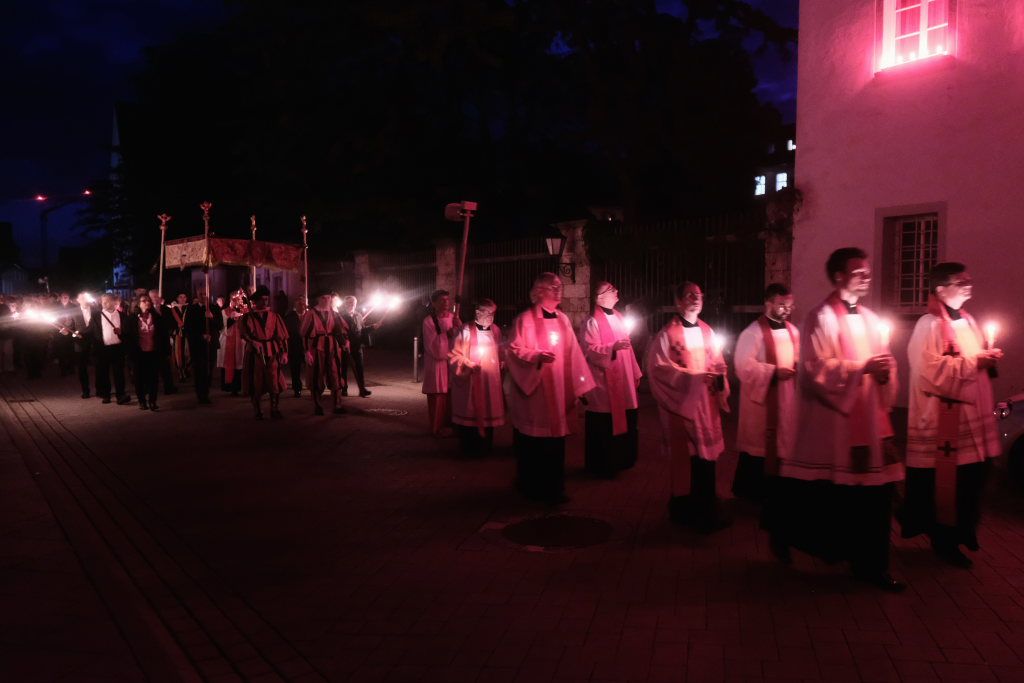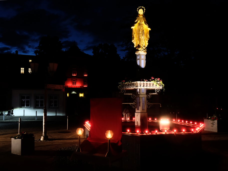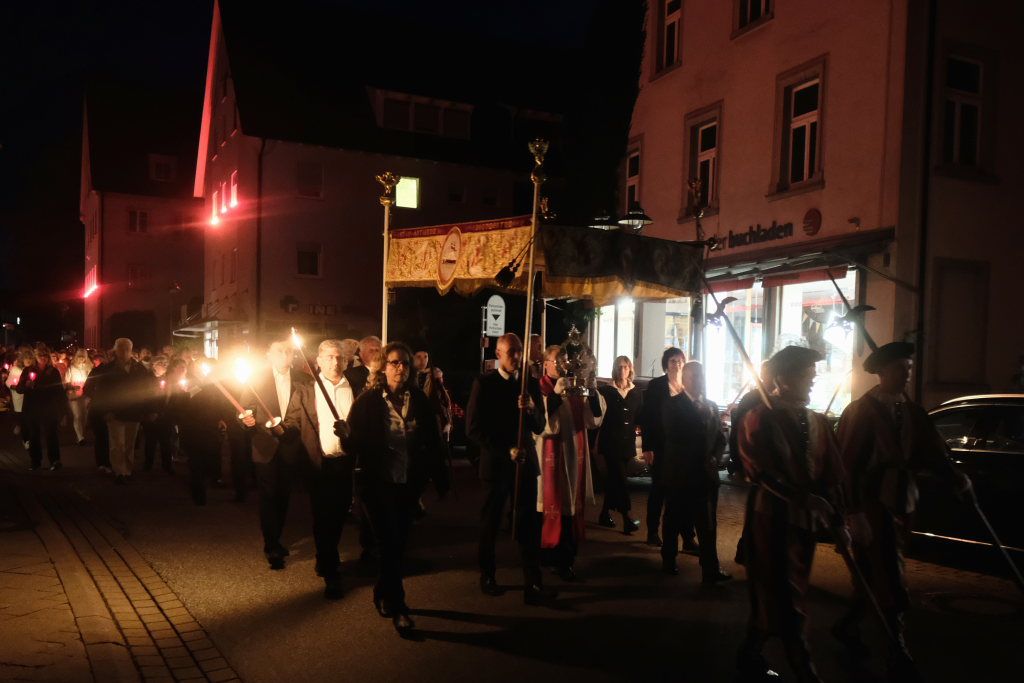Pfarrer Maier trug die Reliquienmonstranz unter dem reichverzierten “Himmel” hinab in die Stadt, vorbei an auffallend vielen geschmückten und beleuchteten Häusern. Auch Schloss, Rathaus und Amtshaus waren illuminiert. Am Marienbrunnen verlas Gemeindereferentin Angelika Schupp die Botschaft zur jungfräulichen Empfängnis Mariens. Von dort bis zum Klosterplatz und zur St. Verena-Kirche übernahm dann Pfarrer Patrick Meschenmoser die Reliquie. Auf dem ganzen Weg wurde gebetet, unter anderem die Allerheiligen-Litanei.