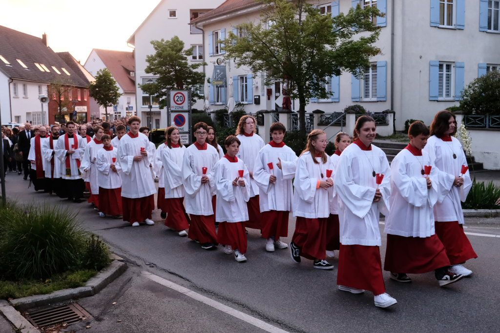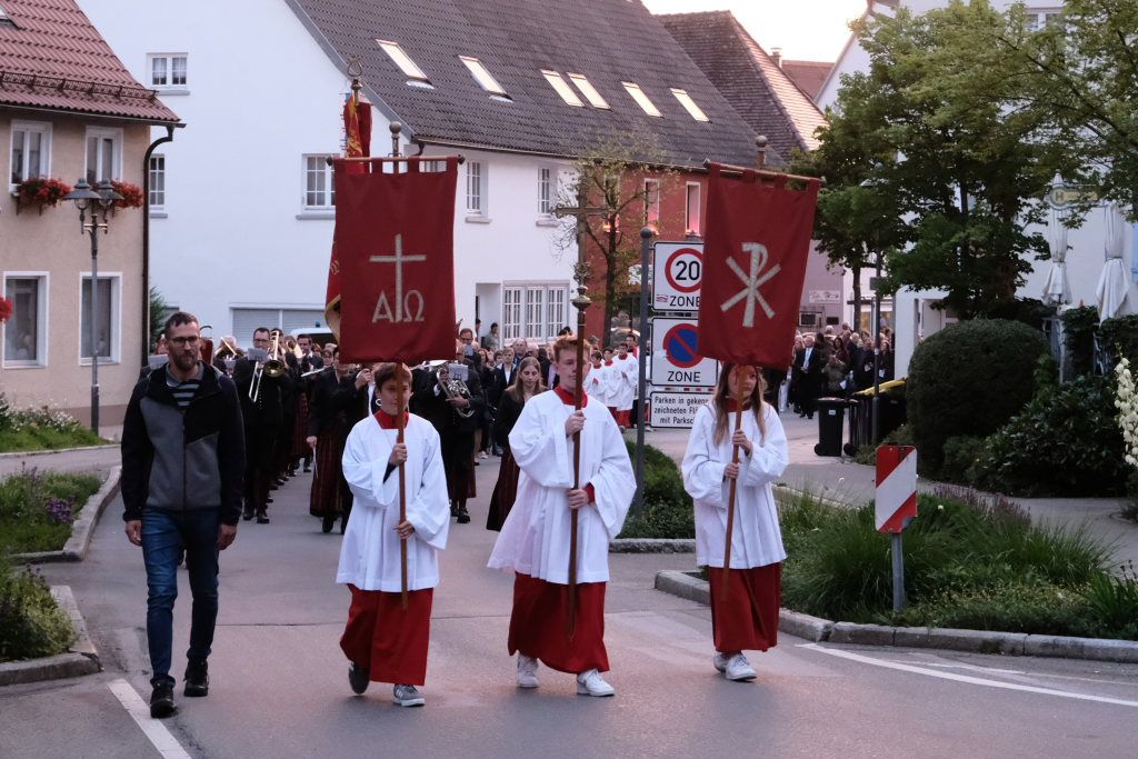 Es war ein erhabener Anblick, den der Klosterplatz beim Schlusssegen bot, der den Gläubigen erstmals seit vielen Jahren wieder dort von der Kirchentreppe aus gespendet wurde. Sehr zum Gefallen der Prozessionsteilnehmer, die nach dem Schlusslied der Stadtkapelle noch lange in Gruppen dort verweilten.