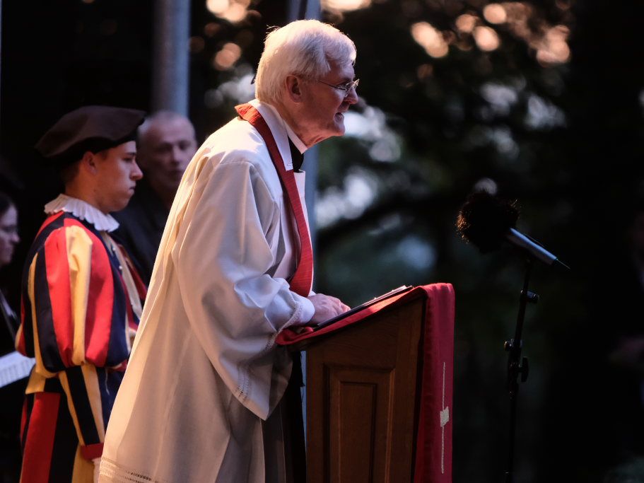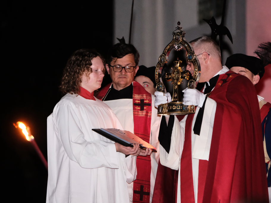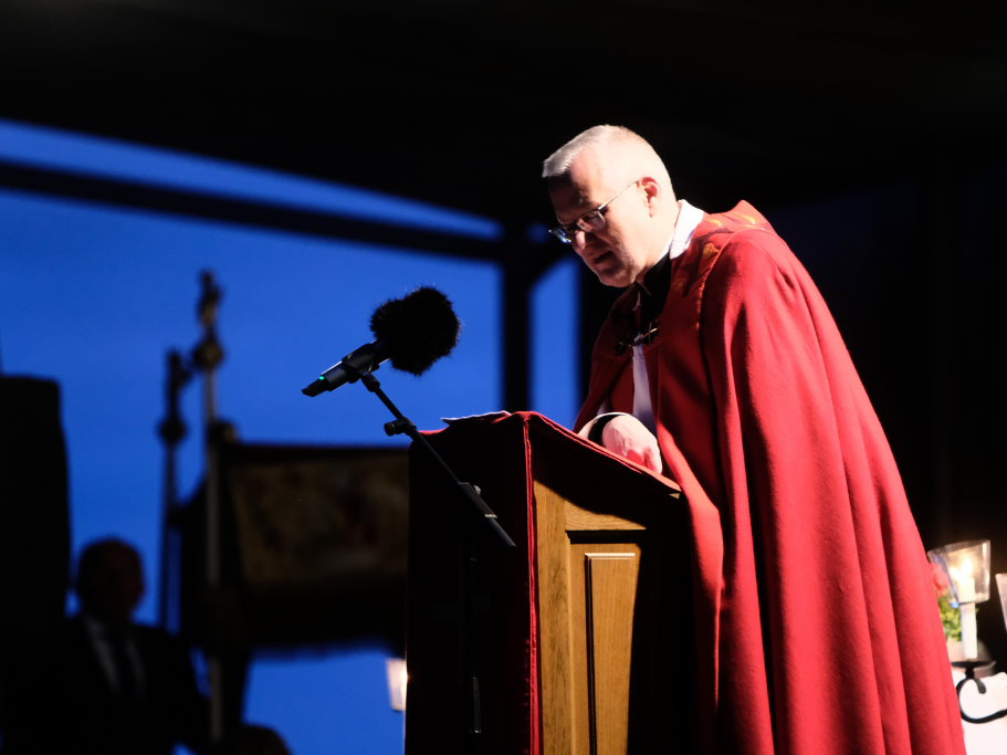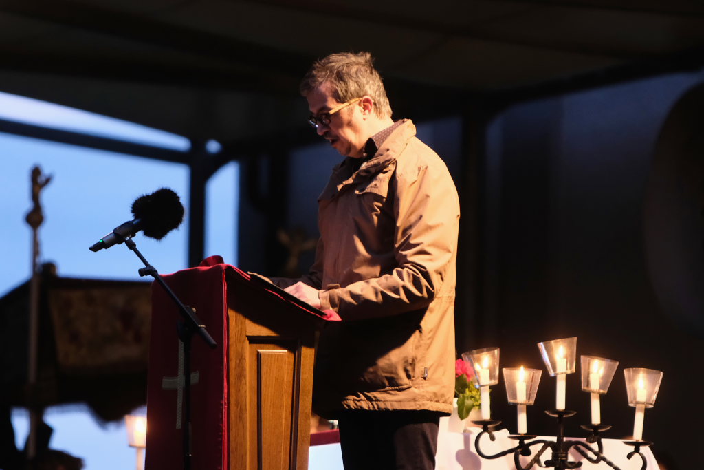 Pfarrer Maier eröffnete seine Predigt mit dem Hinweis, dass das Johannes-Evangelium vom Leiden und Sterben Jesu so zentral für den Glauben sei, so dass an Karfreitag immer Kapitel 19, 25-30 gelesen werde. „Johann Sebastian Bach hat die Passion nach Johannes vertont.“ Das Kreuz ist das Zeichen des Glaubens, sagte Pfarrer Maier in der Betrachtung der Johannes-Worte. Das Kreuz auf der Kuppel der Gottesbergkirche leuchte in Rot in der Farbe des Blutes. „Im Blut Jesus Christi staunen wir voller Dankbarkeit darüber, dass wir Gott so wichtig sind, dass er – in seinem Sohn Jesus Christus – für uns – stirbt. Dass er nicht nur unser Schicksal mit uns teilt und unsere Not und unser Leid, sondern sogar unseren Tod!“