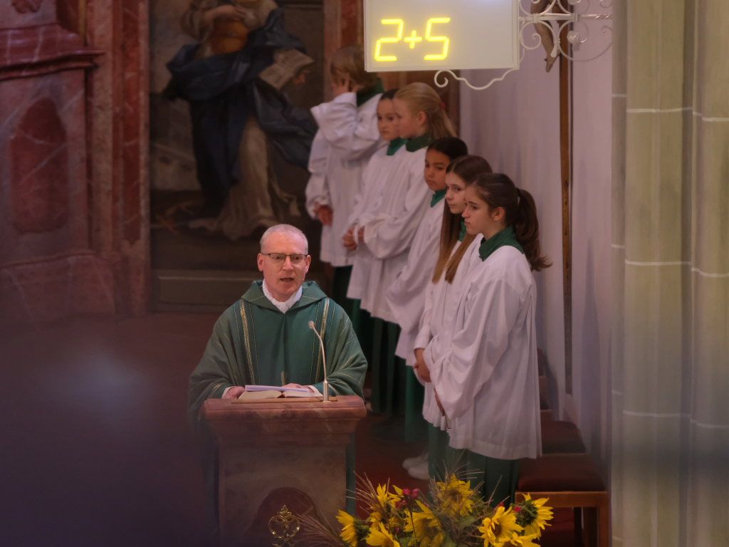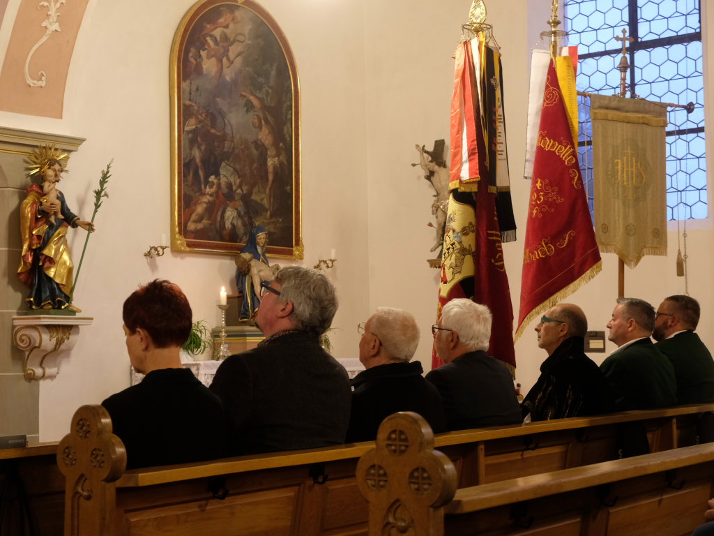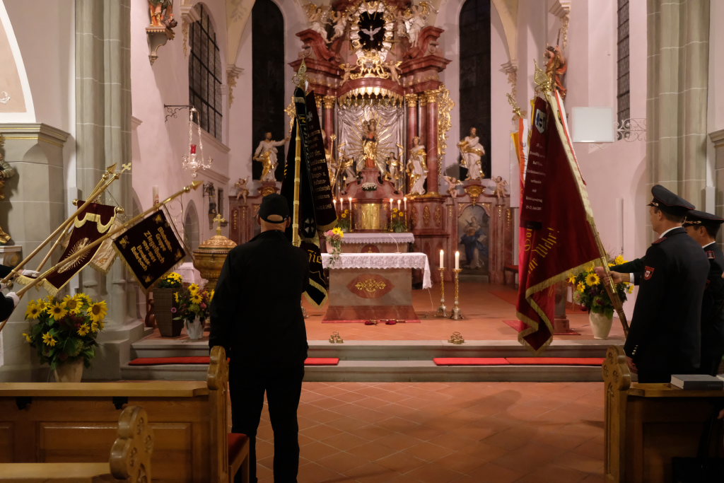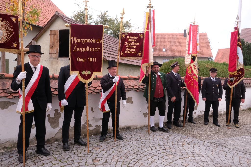Mit zehn Ministranten, den Fahnenabordnungen von Feuerwehr, Blutreitern, Musik und Kriegerverein zog die Festgemeinde unter den Klängen des Kirchenchores mit Pfarrer Patrick Meschenmoser zum Festgottesdienst in die Kirche ein.