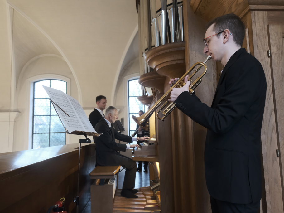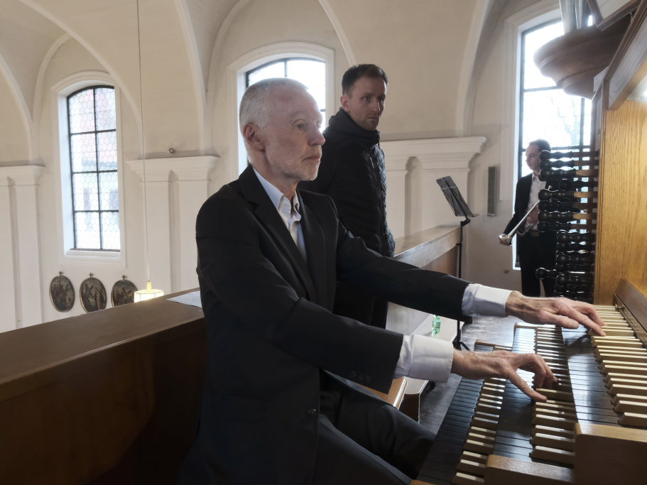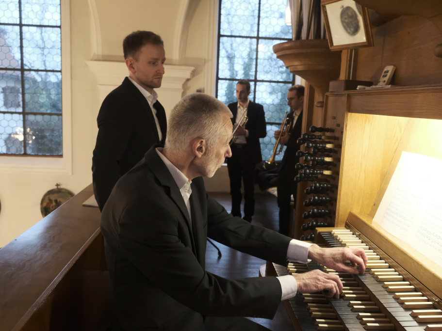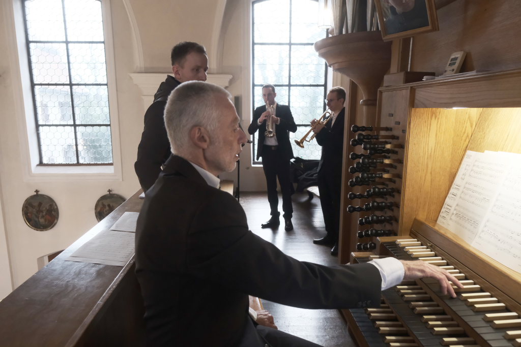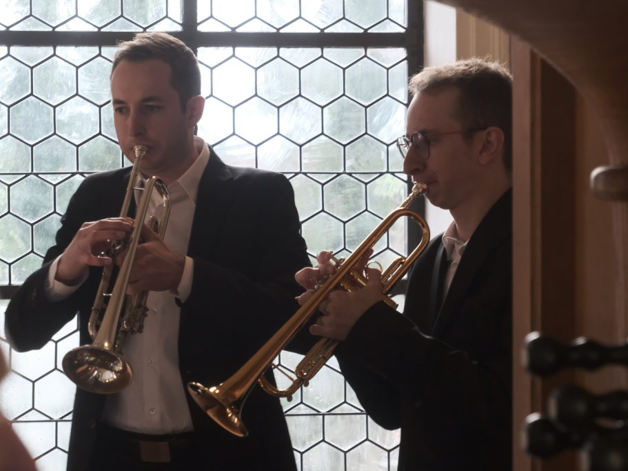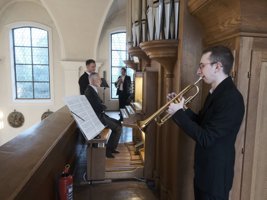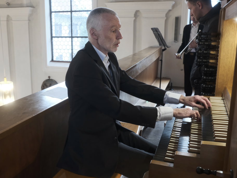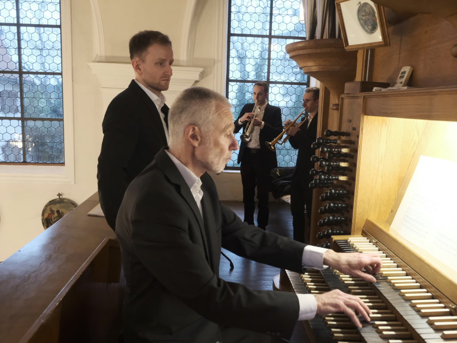 Bei dem Stück „The Cathedral“ nach einem altenglischen Traditional in der Bearbeitung von Thorsten Pech postierten sich die beiden Trompeter links und rechts der von Robert Häusle bespielten Orgel. Mit dem tschechischen Komponisten und Organisten Frantisek Musil (1852-1908) und seiner „Sonata solemnis und Allegro-Canone-Fuga“ verließen die Musiker kurz die Barockzeit und besuchten die Epoche der Spätromantik und des angehenden Im- und Expressionismus. Häusle und die Trompeter ließen die Sonate sehr feierlich erklingen, der zweite kanonartige Satz blieb ebenfalls sehr getragen. Das Stück endete mit einer Fuge.
