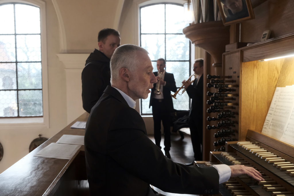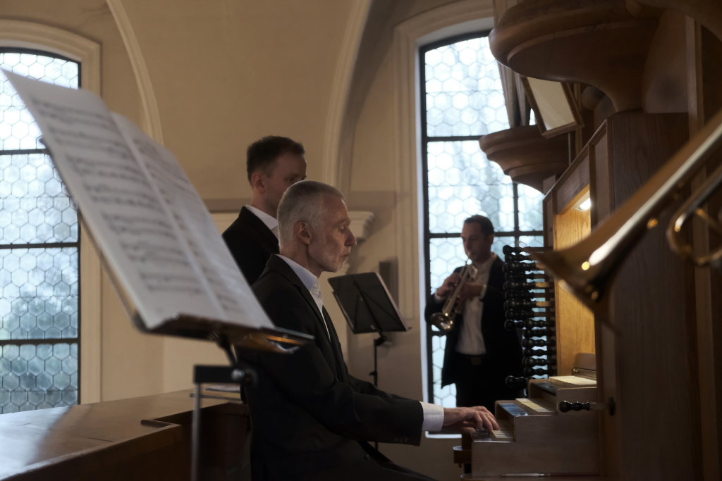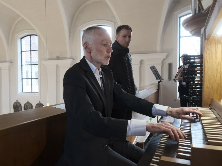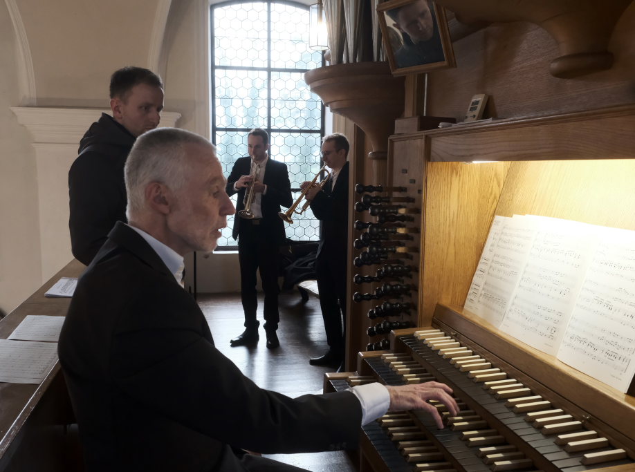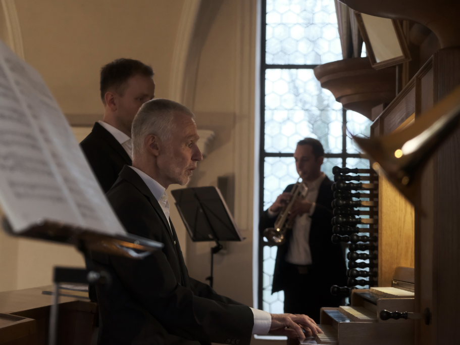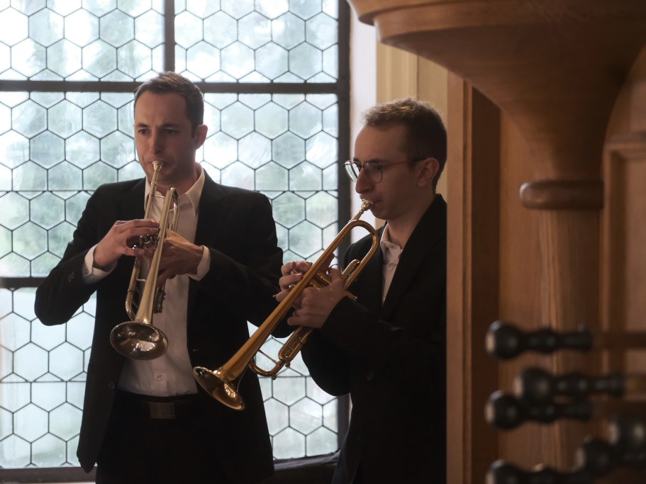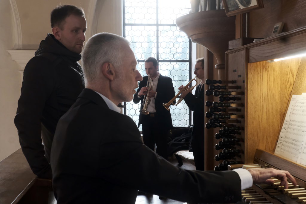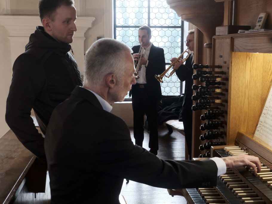 Bei dem Stück „The Cathedral“ nach einem altenglischen Traditional in der Bearbeitung von Thorsten Pech postierten sich die beiden Trompeter links und rechts der von Robert Häusle bespielten Orgel. Mit dem tschechischen Komponisten und Organisten Frantisek Musil (1852-1908) und seiner „Sonata solemnis und Allegro-Canone-Fuga“ verließen die Musiker kurz die Barockzeit und besuchten die Epoche der Spätromantik und des angehenden Im- und Expressionismus. Häusle und die Trompeter ließen die Sonate sehr feierlich erklingen, der zweite kanonartige Satz blieb ebenfalls sehr getragen. Das Stück endete mit einer Fuge.