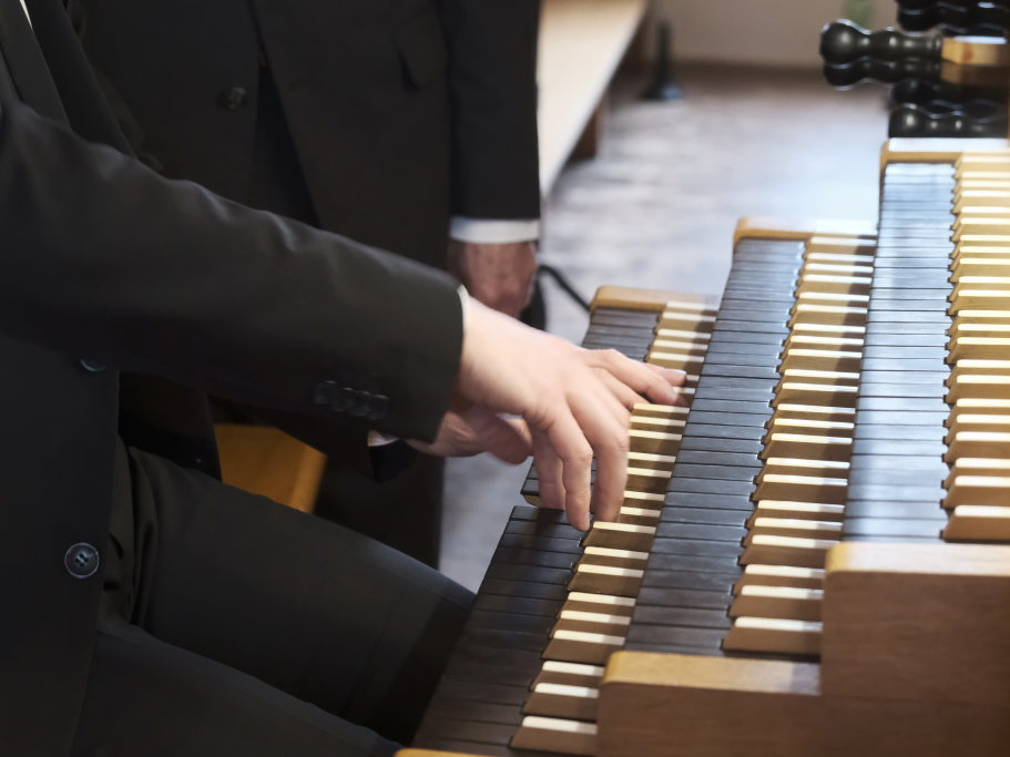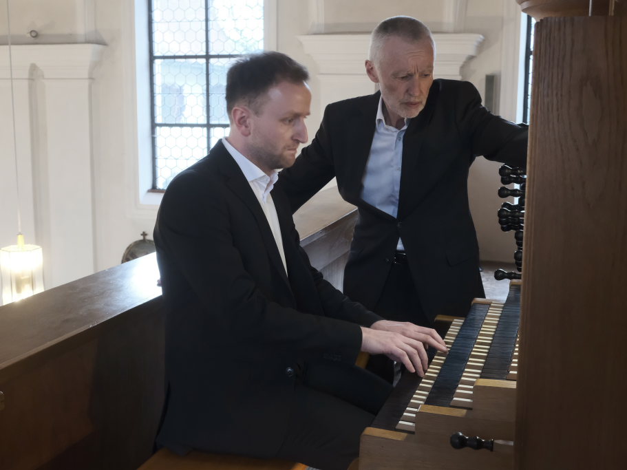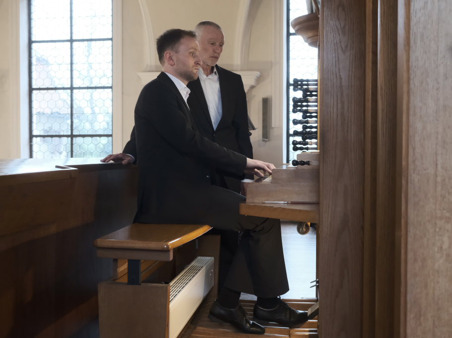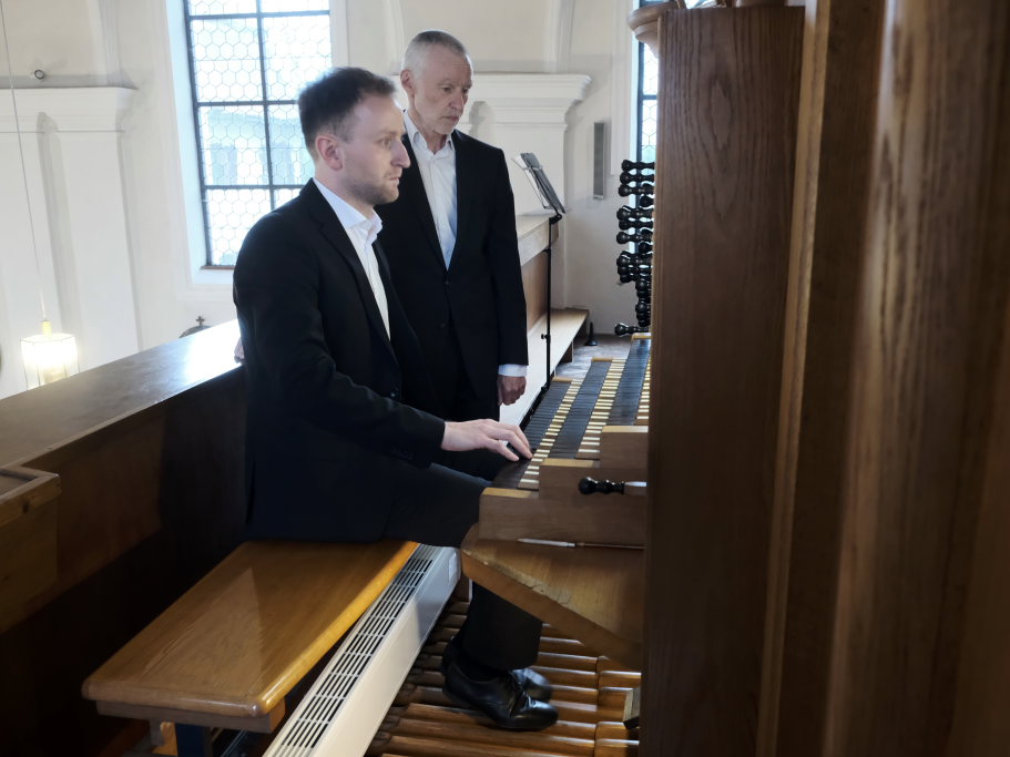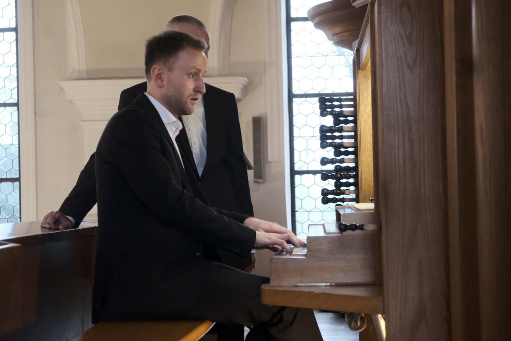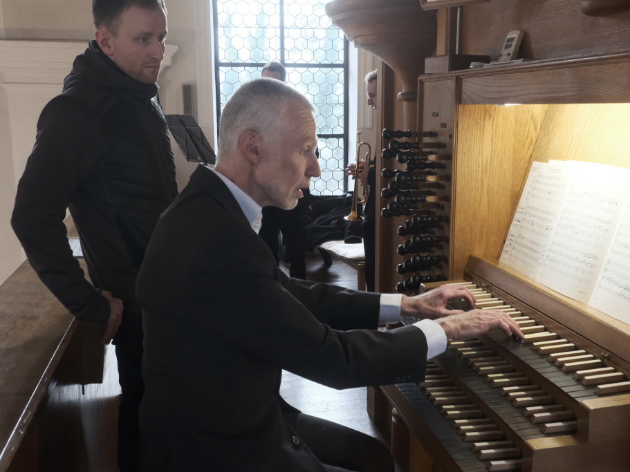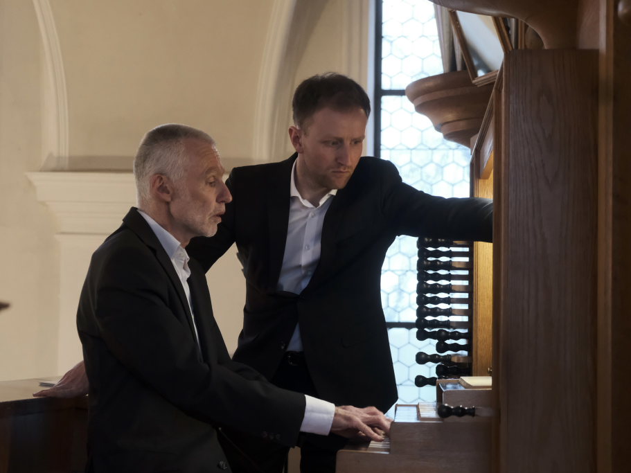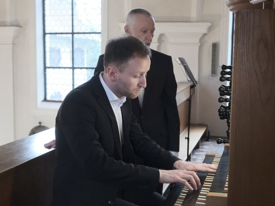 Bei dem Stück „The Cathedral“ nach einem altenglischen Traditional in der Bearbeitung von Thorsten Pech postierten sich die beiden Trompeter links und rechts der von Robert Häusle bespielten Orgel. Mit dem tschechischen Komponisten und Organisten Frantisek Musil (1852-1908) und seiner „Sonata solemnis und Allegro-Canone-Fuga“ verließen die Musiker kurz die Barockzeit und besuchten die Epoche der Spätromantik und des angehenden Im- und Expressionismus. Häusle und die Trompeter ließen die Sonate sehr feierlich erklingen, der zweite kanonartige Satz blieb ebenfalls sehr getragen. Das Stück endete mit einer Fuge.
