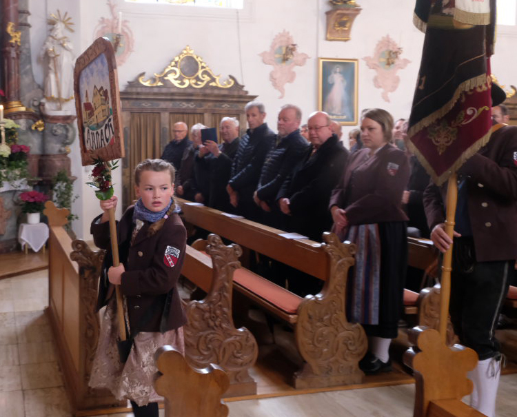 Nach dem Einzug in die Kirche begab sich die kleine Bläsergruppe des Arnacher Musikvereins hinauf auf die Empore, von wo aus sie den Gottesdienst gemeinsam mit der Orgel musikalisch begleitete, während die anderen Musiker sowie die Ehrengäste zu den für sie reservierten Kirchenbänken gingen und die Standarten- und Fahnenträger im Chorraum Platz nahmen.