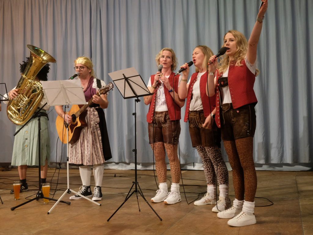 Während die Musikkapelle Harmonie Unterschwarzach bei ihrem Beitrag auf Gesang umgestiegen war, wie immer mit Dirigent Manfred Bachmoor als Rhythmus- und Taktgeber und Andreas Humm, Winfried und Bernd Schuler als männliche Sänger und Stefanie Schneider, Silvia Lieb und Diana Heine als ihre weiblichen Pendants, taten sich Vorstand Felix Maucher und Tenorhornist Norbert „Nobbe“ Wirth an den natürlich zu Beginn noch vollen Weißbiergläsern gütlich.