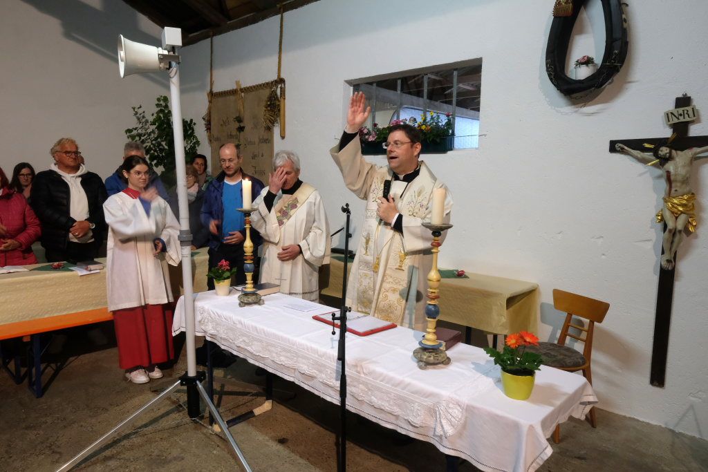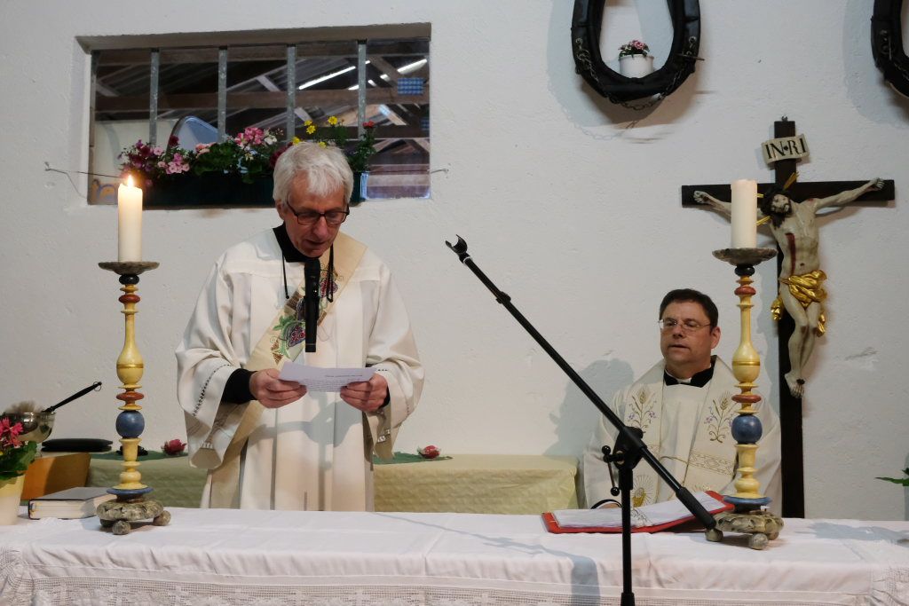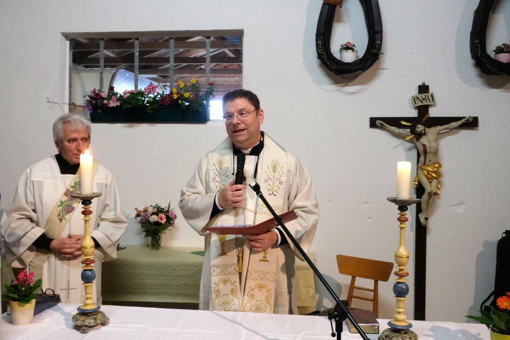 Aufgrund des langanhaltenden Regenwetters – die Haidgauer Ortsvorsteherin Ernestina Frick ließ sich für die Feier entschuldigen, weil sie in Sachen Hochwasserschutz unterwegs war – fand die Maiandacht in der Scheune von Familie Liebrich statt, der die Kapelle eine Herzensangelegenheit ist und die sich seit vielen Generationen darum kümmert.
