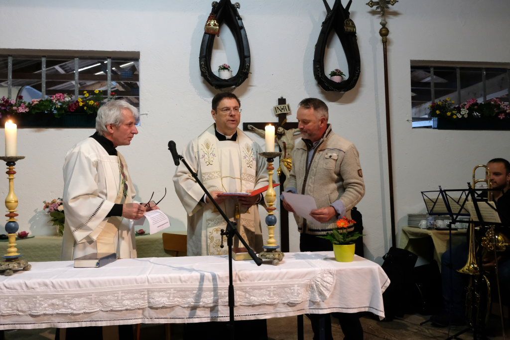 Diakon Franz Fluhr begab sich danach mit Vortragekreuz und begleietet von Thomas Neyer zur Kapelle, um mit Weihwasser die Segnung der Kapelle außen wie innen zu vollziehen, während in der Liebrich´schen Scheune die von einem Bläserquartett des Musikvereines Molpertshaus musikalisch begleitete Maiandachtsfeier von Pfarrer Stegmaier weitergeführt wurde.