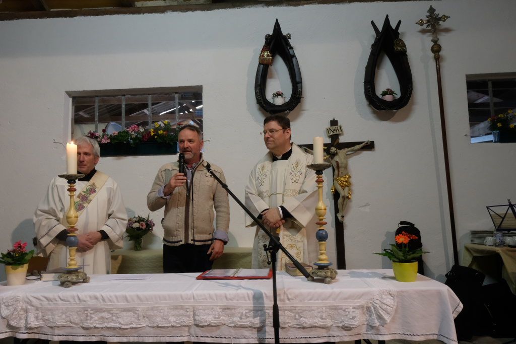 Pfarrer Stegmaier ging in seiner kleinen Ansprache auf den Namensgeber der Kapelle, den Heiligen Josef und sein nicht unkompliziertes Verhältnis zur Heiligen Familie ein. Dieser wollte, als er erfuhr, dass seine Verlobte Maria mit Jesus schwanger war, sie verlassen. Doch nachdem ihm im Traum der Engel des Herrn erschienen war, befolgt er gehorsam den Willen Gottes. Er lässt den Glauben zu, sorgt für seine Familie und beschützt sie.
