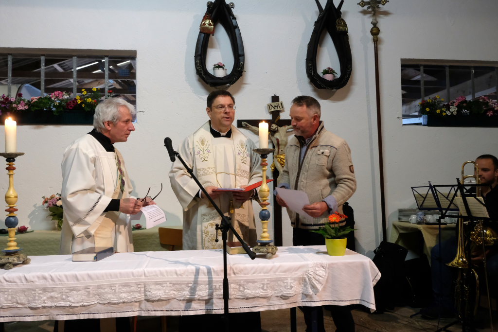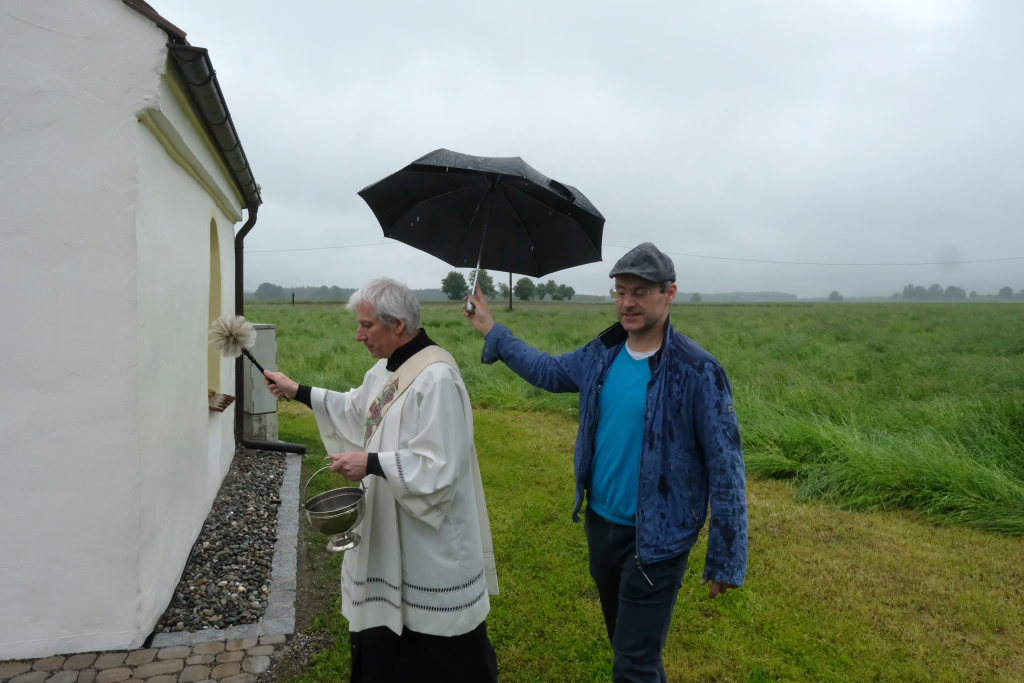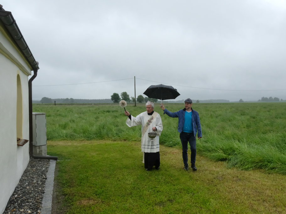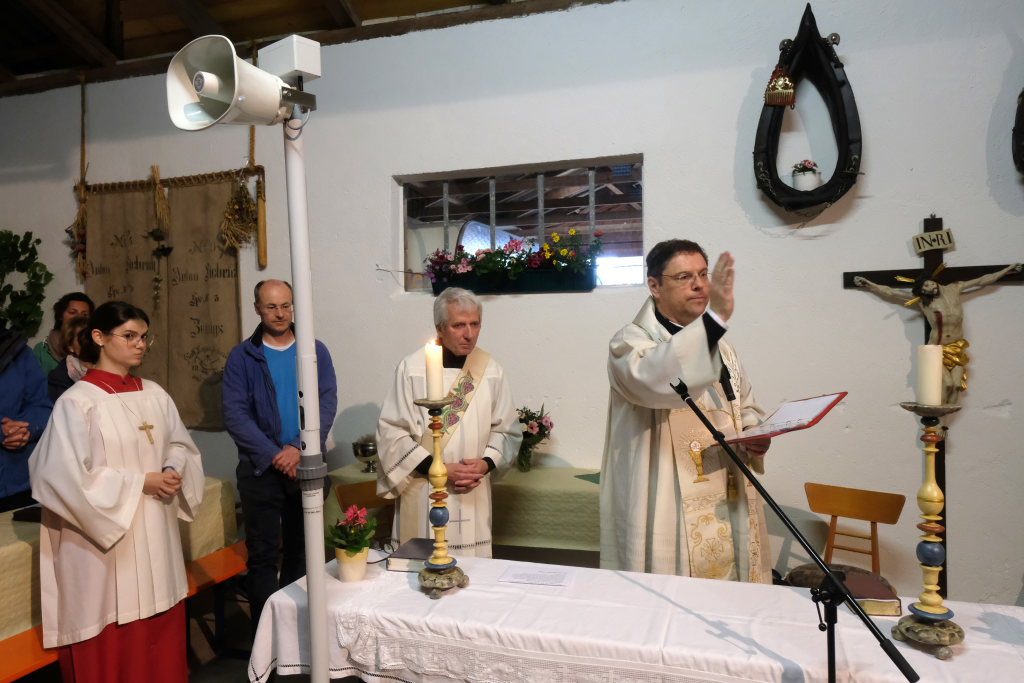 Diakon Franz Fluhr begab sich danach mit Vortragekreuz und begleietet von Thomas Neyer zur Kapelle, um mit Weihwasser die Segnung der Kapelle außen wie innen zu vollziehen, während in der Liebrich´schen Scheune die von einem Bläserquartett des Musikvereines Molpertshaus musikalisch begleitete Maiandachtsfeier von Pfarrer Stegmaier weitergeführt wurde.