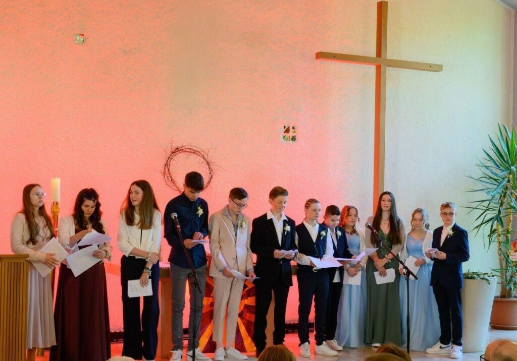 Bad Wurzach – Mit einem aufwändig und sehr lebendig gestalteten Gottesdienst nahm die Evangelische Kirchengemeinde in der bis auf den letzten Platz gefüllten Kirche zwölf Konfirmandinnen und Konfirmanden ihre Mitte auf. Was christliche Gemeinschaft bedeuten kann, wurde besonders an einem Konfirmanden sichtbar, der zunächst seine Taufe erhielt.