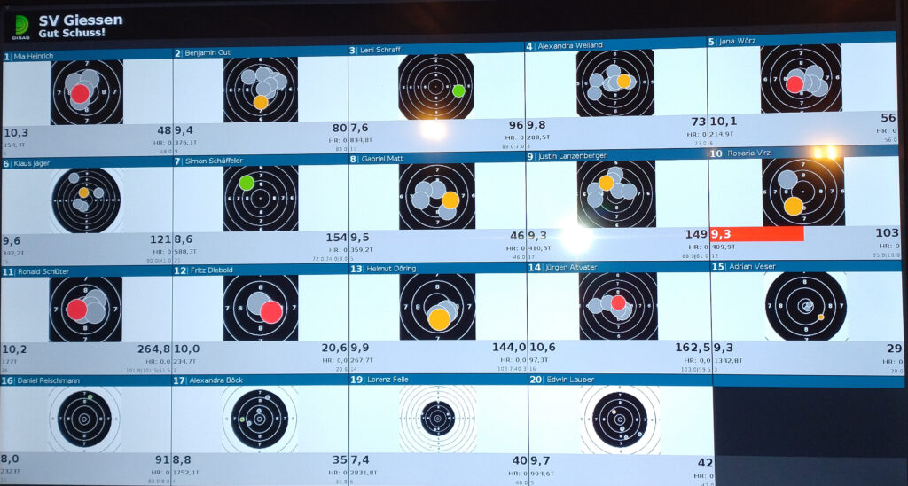 Elektronische Ergebniswand. Grün bedeutet 8, gelb 9 und rot 10.