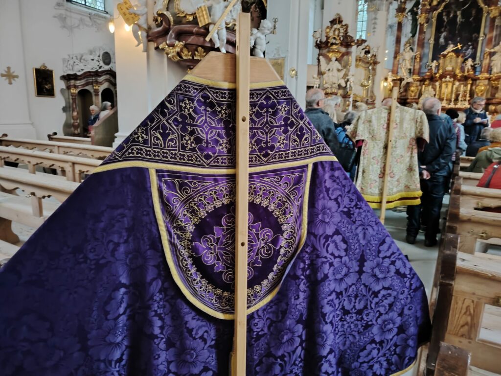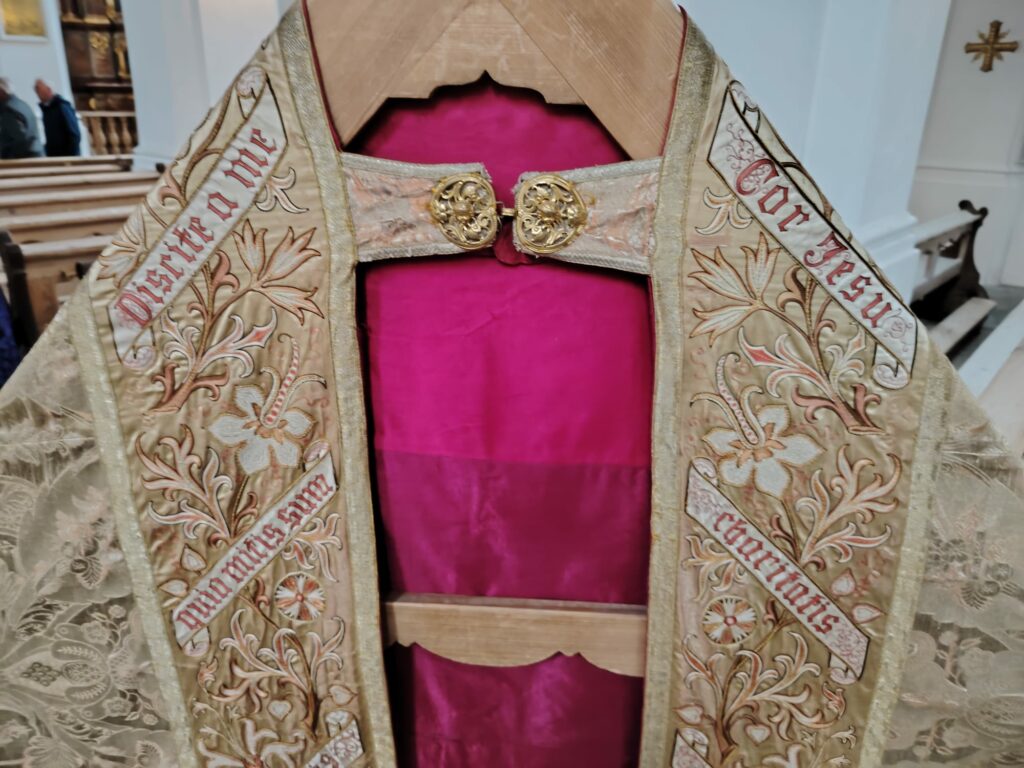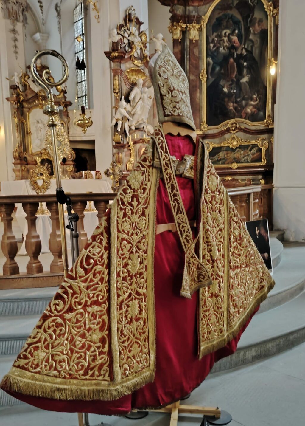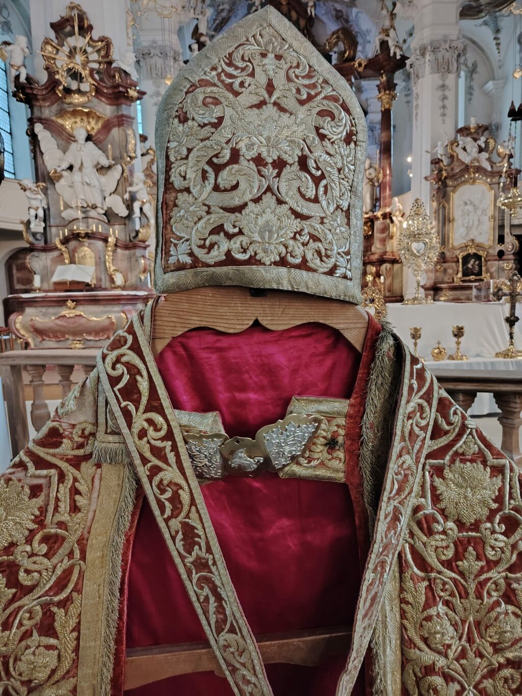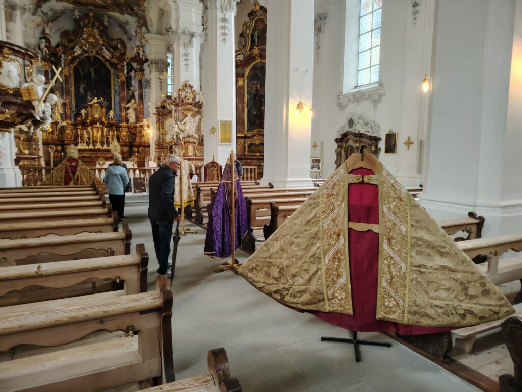 Ein Höhepunkt der kleinen Ausstellung war zweifellos die komplette Ausstattung an Gewändern, die Abt Alfons Torelli 1724 in einem süddeutschen Frauenkloster in Auftrag gegeben hatte. Die verschiedenen Teile – Kasel, Stola, Chormantel sowie Mitra des Abtes – sind in rotem Samt gehalten, der kunstvoll bestickt ist. Petra Frey wies auf die Nähe der hier verwendeten Ornamente zum Stuck der im Barock sehr angesagten Wessobrunner Stuckatoren hin, die damals auch in Isny arbeiteten. Aber auch die übrigen Textilen, vor allem die verschiedenen, für die Besucher ausgestellten weiten Chormäntel, beeindruckten.