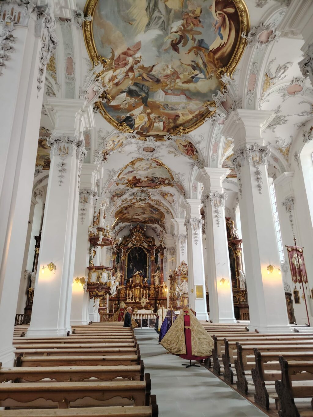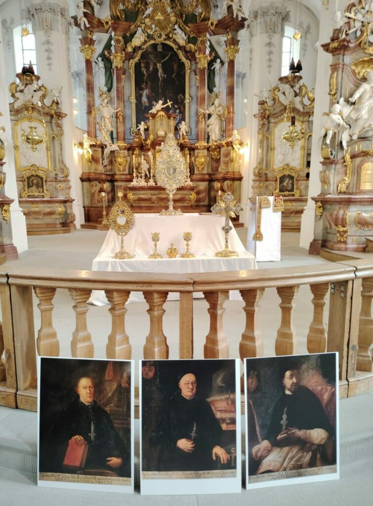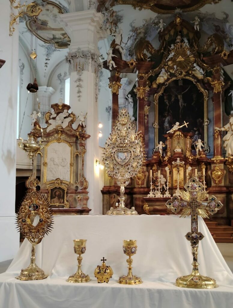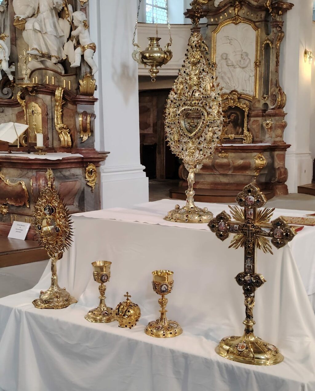Am meisten Eindruck auf die Besucher machte aber sicher die große blattförmige Monstranz, die die Abtei um 1700 bei dem Augsburger Goldschmied Michael Hafner in Auftrag gegeben hatte. In diesem prachtvollen Schaugefäß wurde früher an besonderen Feiertagen und natürlich vor allem an Fronleichnam den Gläubigen die Hostie gezeigt, in der nach der katholischen Lehre der Leib Christi präsent ist.