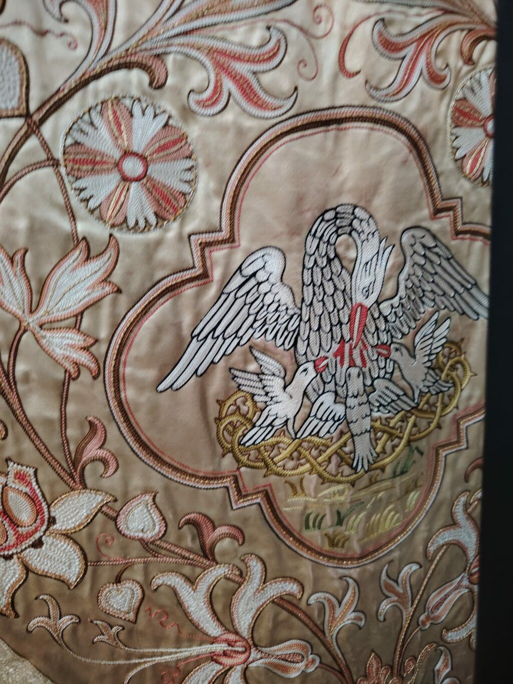 Zuerst wandte sich die Referentin den ausgestellten liturgischen Prachtgewändern zu. Die verwendeten, äußerst kostbaren Stoffe wurden in aufwändigster Handarbeit zunächst gewebt, später häufig zusätzlich bestickt. Gerade mit den – in der Regel mit Goldfäden – reliefartig bestickten Gewändern konnten ganz besondere Effekte erzielt werden. Die Stoffe zeigen häufig rankende pflanzliche Ornamente. Aber man entdeckt auch figürliche Darstellungen wie etwa Engel oder, auf der Kapuze eines Chormantels, einen Pelikan, der als Symbol für den Opfertod Christi galt.