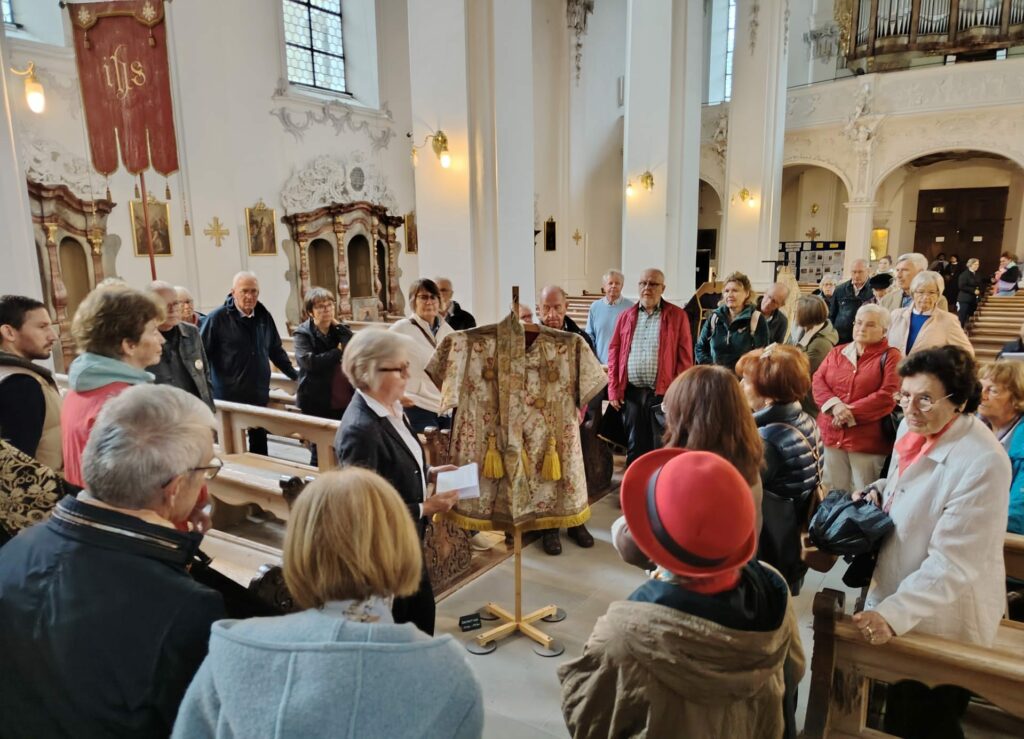 Im Unterschied zu anderen Städten des Allgäus wie Leutkirch oder Kempten liegt Isny nicht an der Oberschwäbischen Barockstraße. Warum auch immer. Aber die Stadt liegt natürlich mittendrin in den vom Barock geprägten Sakrallandschaften von Allgäu und Oberschwaben. Der Sprecher der Arbeitsgemeinschaft Heimatpflege Rudolf Daumann nannte bei seiner Begrüßung in der Stadtpfarrkirche St. Georg und Jakobus diese denn auch nicht ohne Grund „die schönste Rokokokirche des Westallgäus“. Gut 40 interessierte Besucher waren am Sonntag, 14. September, kurz vor Mittag in die ehemalige Klosterkirche der Benediktiner gekommen, zur ersten von mehreren Führungen. Bei diesen wurde eine ganz besondere Ausstellung präsentiert, die zwar nur für einen Tag aufgebaut worden war, aber bedeutsame, normalerweise nicht zugängliche Kostbarkeiten zeigte: Im Mittelgang und im Chorraum der Kirche hatten die Ehrenamtlichen der AG Heimatpflege über speziellen Gestellen edle liturgische Gewänder aufgehängt und auf einer Tafel wertvolles Kirchengerät aufgebaut.