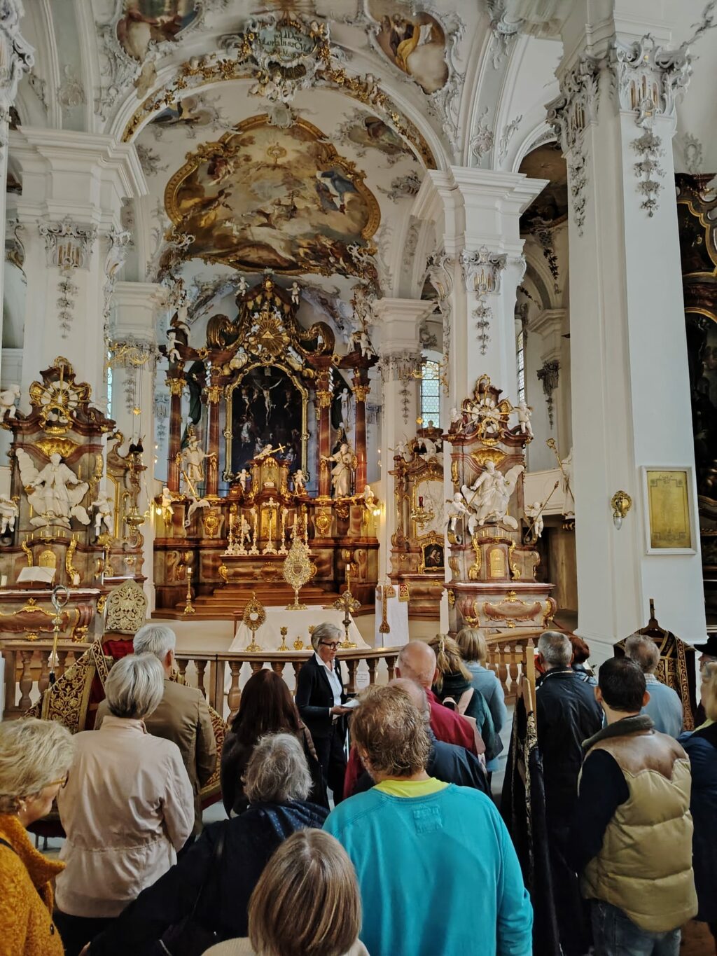 Dem heutigen Publikum stellt sich natürlich zuallererst die Frage: Warum diese ganze Pracht? Petra Frey erläuterte, dass der Prunk kein Selbstzweck war oder etwa nur die Eitelkeit der Äbte befriedigen sollte. Die kirchliche Prachtentfaltung, mit der natürlich auch die Katastrophe des Dreißigjährigen Krieges endgültig überwunden wurde, war sozusagen offizielle Politik. Die katholische Kirche setzte in der Gegenreformation auch auf sinnliche Überwältigung der Gläubigen. In den Kirchen und Gottesdiensten wurde ganz bewusst ein „Theatrum Sacrum“ (heiliges Theater) angestrebt. In einem Gesamtkunstwerk sollte dabei alles zusammenwirken: die Architektur, die Ausstattung der Kirchen mit Malerei, Plastik und Stuck, die Musik, die Lichtführung – und natürlich auch die Gewänder und Gerätschaften, die im Gottesdienst verwendet wurden.