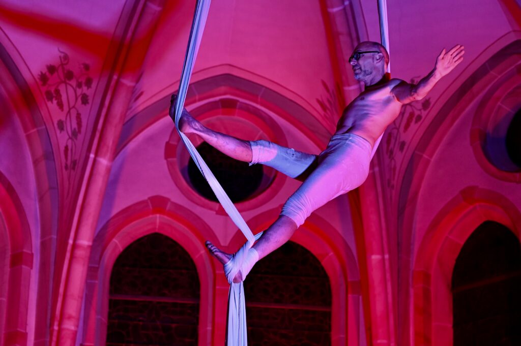 Benjamin Sigg hatte zuvor erläutert, worum es geht bei dieser Akrobatik. Es ist eher wie ein Gebet, erzeugt mit dem Körper. Es geht um das Leben Jesu und beginnt mit einer Embryo-Haltung, zwölf Meter über dem Boden. Langsam, bedächtig, atemberaubend, was Carismo zeigt, wie er sich bewegen kann, Tücher und Körper völlig unter Kontrolle, ein wahrer Artist. Man kann gut die Kreuzigung, die Grablegung und die Auferstehung mit Himmelfahrt erkennen. Einmal windet sich Carismo ganz hoch unter die Chorraum-Decke und lässt sich, wie erwartet, schnell abwärts ins Tuch fallen. Der Atem stockt, alles gut gegangen, einen Fehler beim Tuchwickeln darf er sich nicht erlauben.