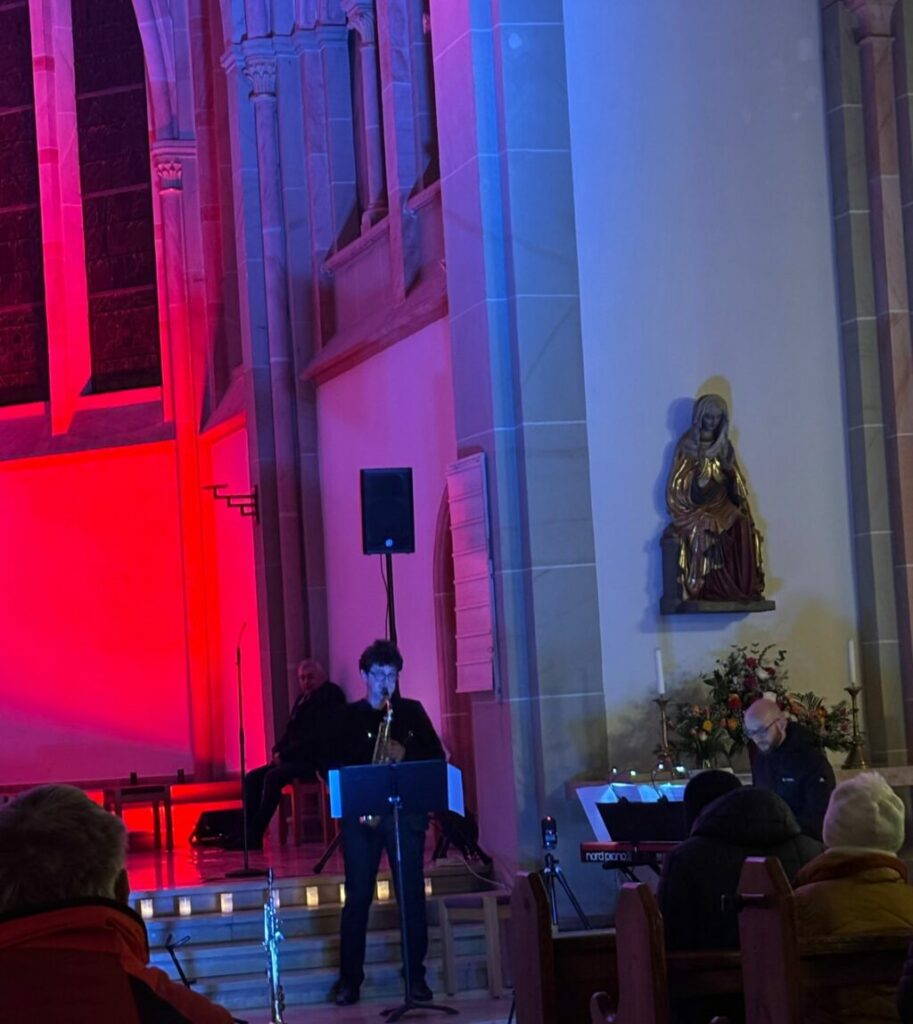 Isny – Das Publikum in der vollen Kirche St. Maria durfte Mitte Januar etwas ganz Außergewöhnliches erleben und staunte nur noch. Sehr langer Beifall war der Lohn für die Künstler, zum einem am Stofftuch, zum anderen an den Instrumenten Saxophon und Piano. Pastoralreferent Benjamin Sigg moderierte diese besondere Stunde „Allgäu-Segen“ in der rot und pink erleuchteten Kirche.