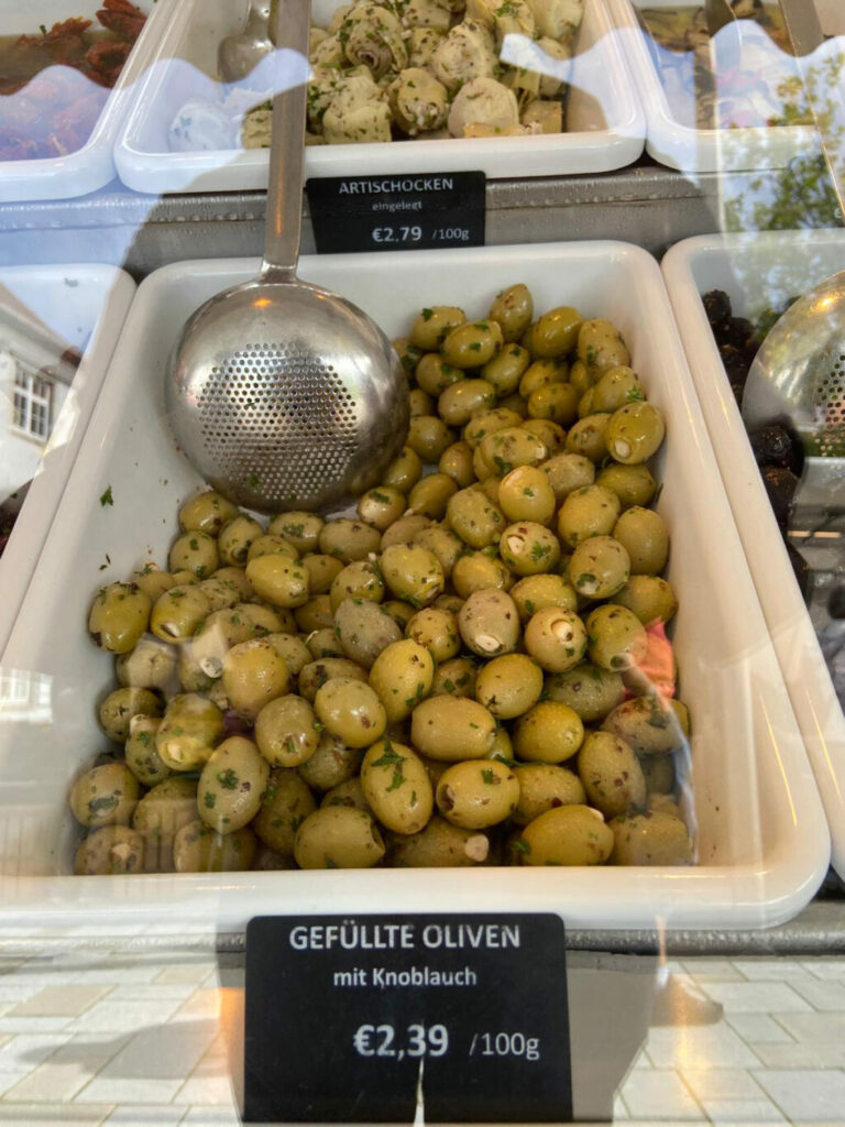 Täglich werden die Produkte frisch zubereitet und verfeinert. Das Anrichten in Handarbeit und nach hauseigenen Kreationen macht die Produkte zu besonders köstlichen Spezialitäten. Beste Zutaten und individuelle Rezept verbinden sich zu aromatisch eingelegten Oliven, Antipasti, Schafskäse und würzigen Aufstrichen. Die gefüllte Glockenpaprika, das Rucola Pesto oder den Olivensalat sollte man unbedingt probieren!