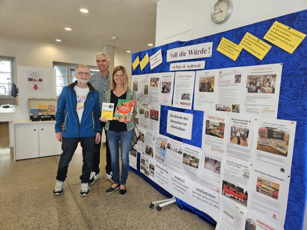 „Die Isnyer Würdewand will ein ermutigendes Zeichen setzen auch gegen alle rechtspopulistischen Tendenzen, die in unserer Gesellschaft Stimmung machen gegen Andersartigkeit, weltweite Solidarität und Vielfalt“ so Diakon Jochen Rimmele vom Eine Welt-Ausschuss der katholischen Kirchengemeinden., der die Aktion koordiniert. Rund 40 Engagementgruppen, Organisationen und Initiativen sind schon dabei. „Die bürgerschaftlichen Gruppen, Organisationen und Initiativen wollen mit der Würdewand eine andere Botschaft senden: Wir sind viele und wir übernehmen Verantwortung füreinander hier und weltweit!“ Die Würdewand möchte auch inspirieren, sich für ein Engagement für die Menschenwürde in Isny und weltweit einzusetzen. „Es ist beeindruckend, wie viele Menschen sich in Isny und seinen Dörfern für die Menschenwürde einsetzen“, zeigte sich Büchereileiterin Anette Schmid berührt, die die Würdewand auch mit einer Buchpräsentation begleitete.