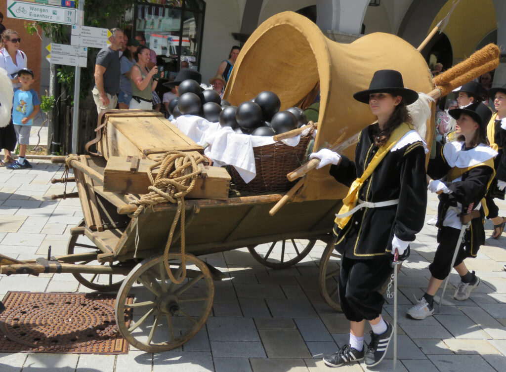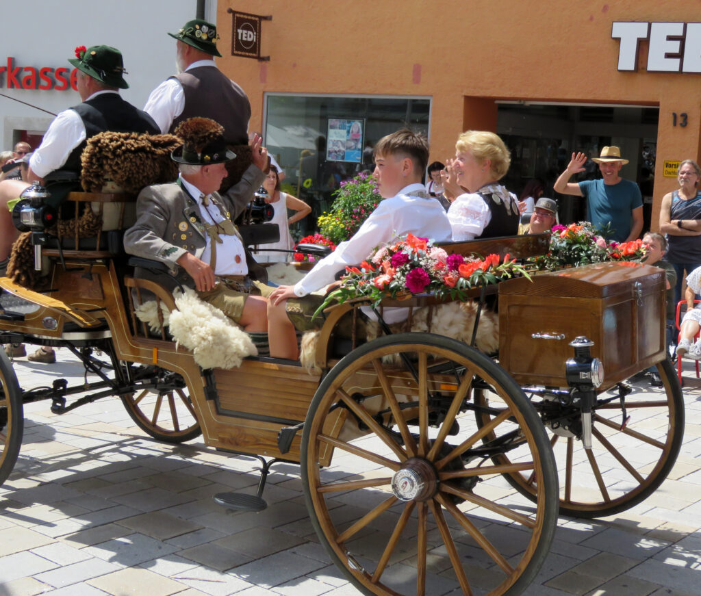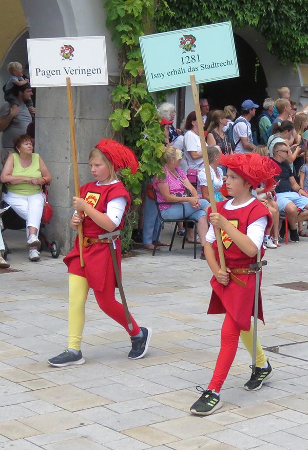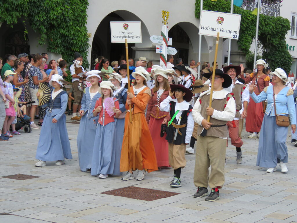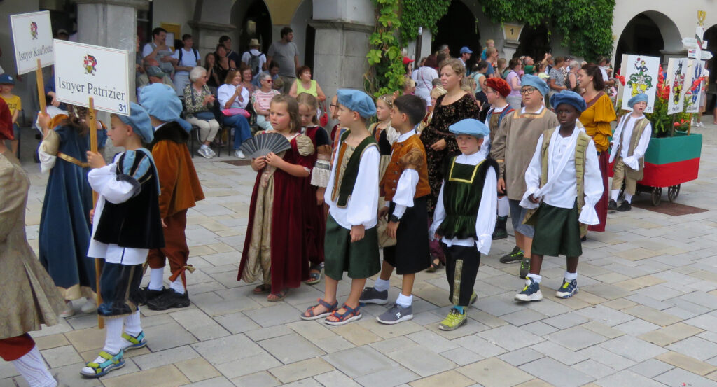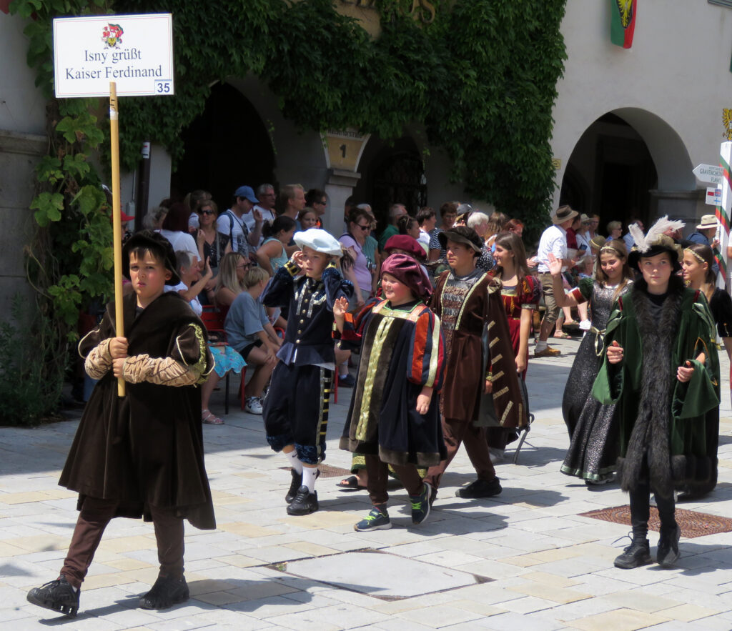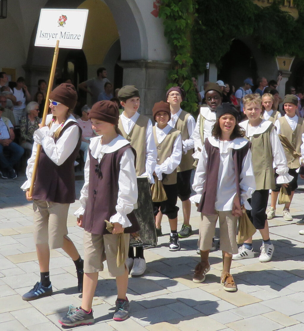 Seit 1620 gibt es das Isnyer Kinder- und Heimatfest – sicherlich unterbrochen in Kriegs- und Notzeiten. Eine stolze Tradition, einer alten Reichsstadt würdig. Handel und Wandel, Leben und – ja, auch Sterben – schienen in dem prächtigen farbenfrohen Umzug auf. So war unter der Überschrift „Heimsuchungen“ ein historischer Leichenwagen zu sehen, der an Pestzeiten gemahnte. Natürlich überwogen die lebensfrohen, die farbenfrohen Motive bei weitem, strahlten ihre Darsteller um die Wette. Und das bei Kaiserwetter!