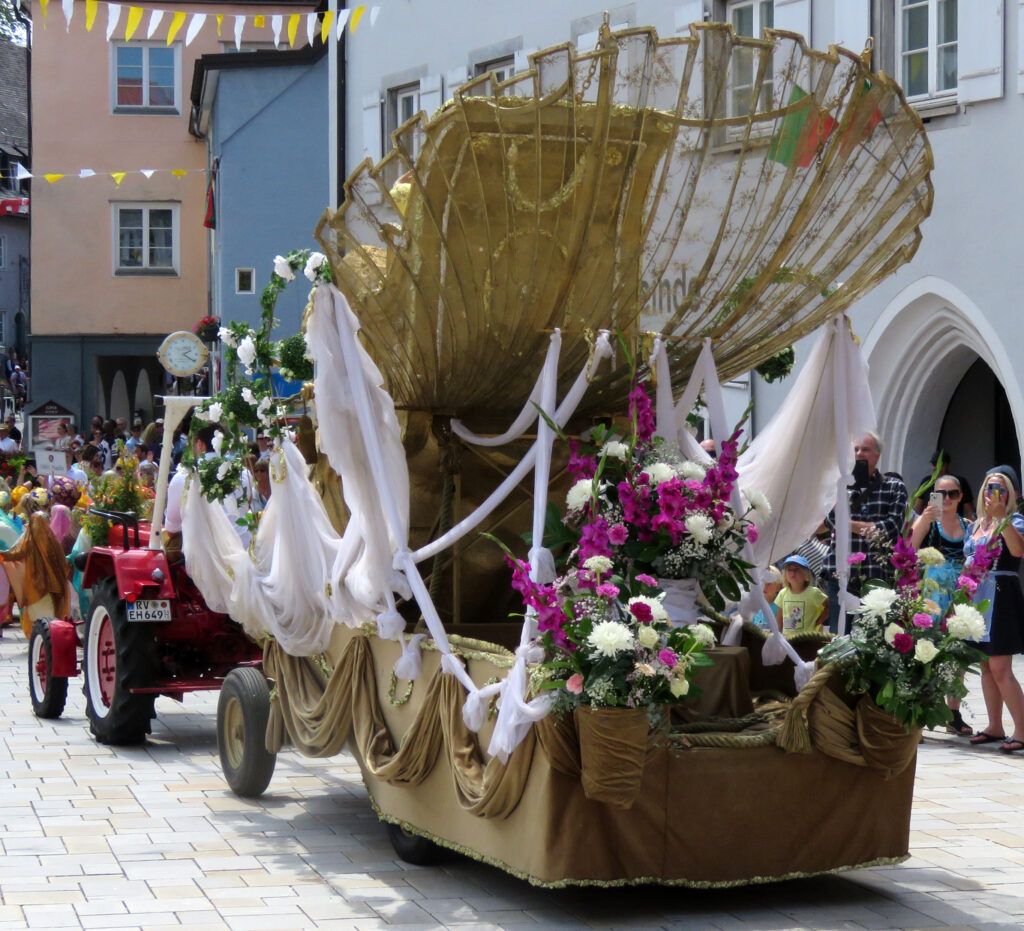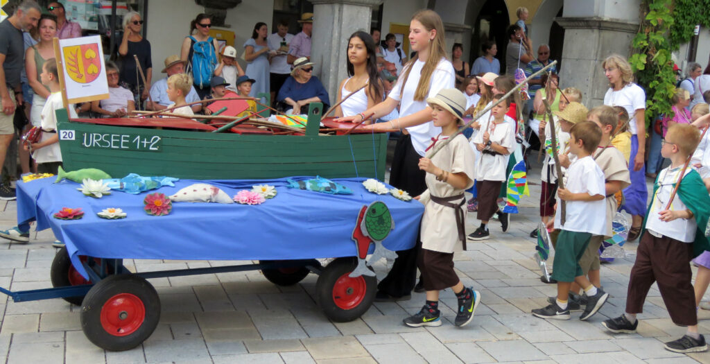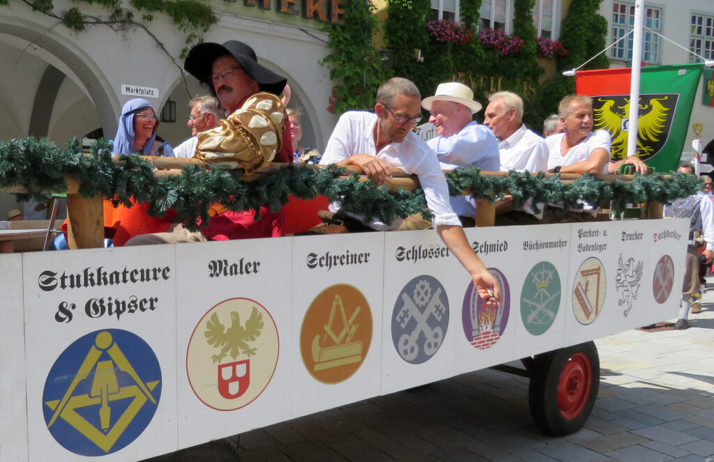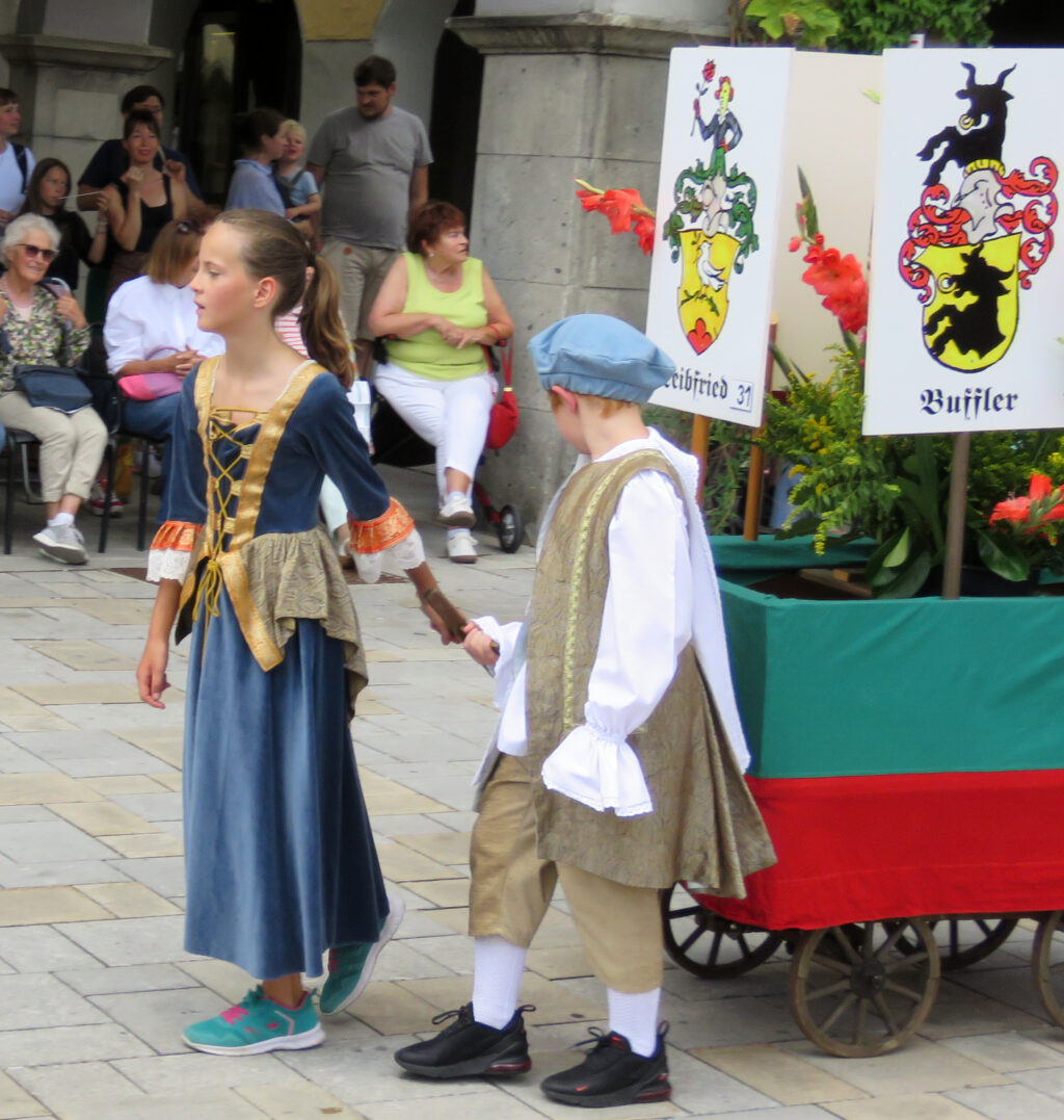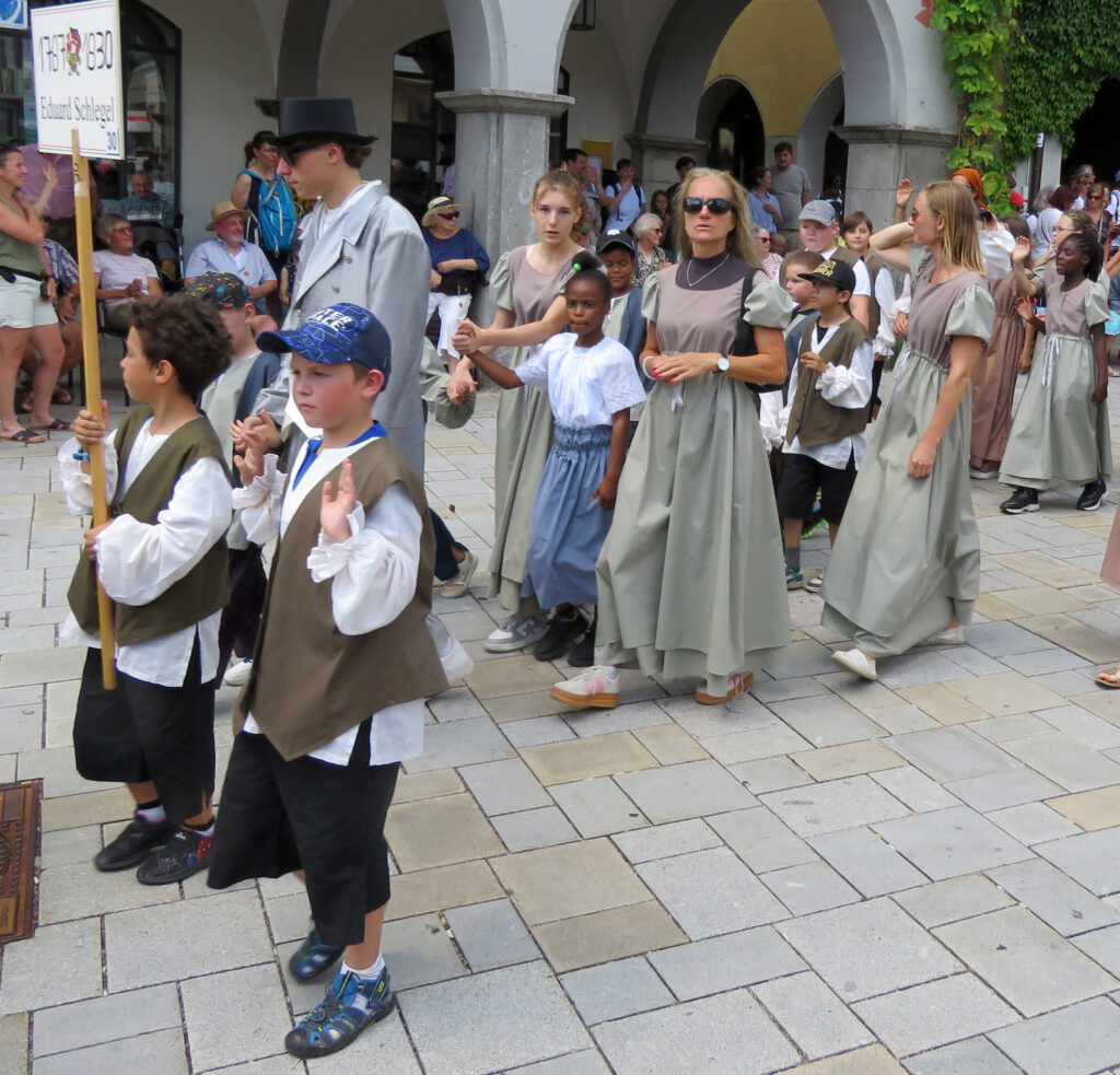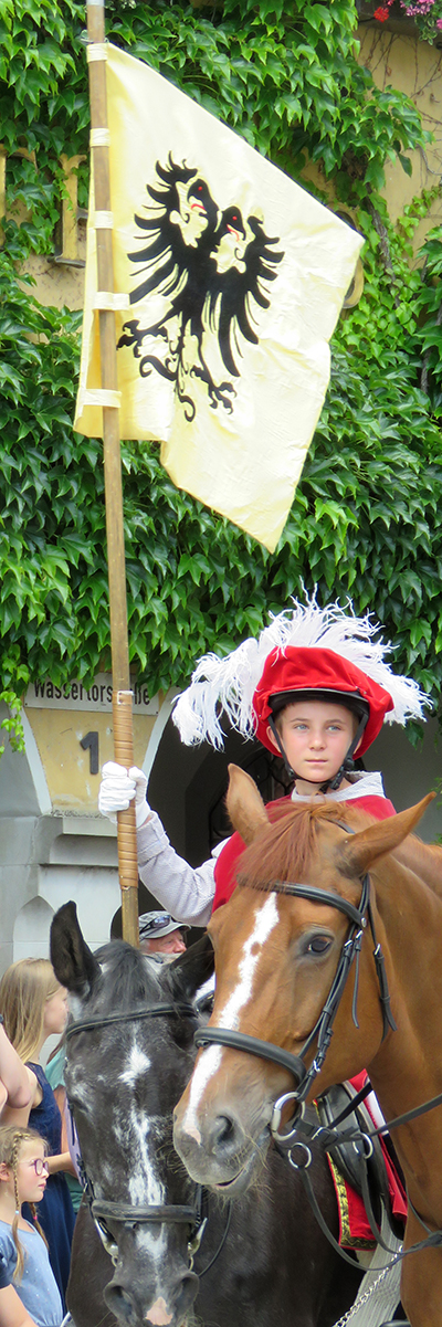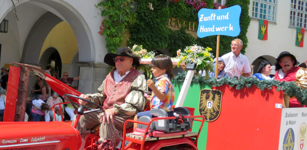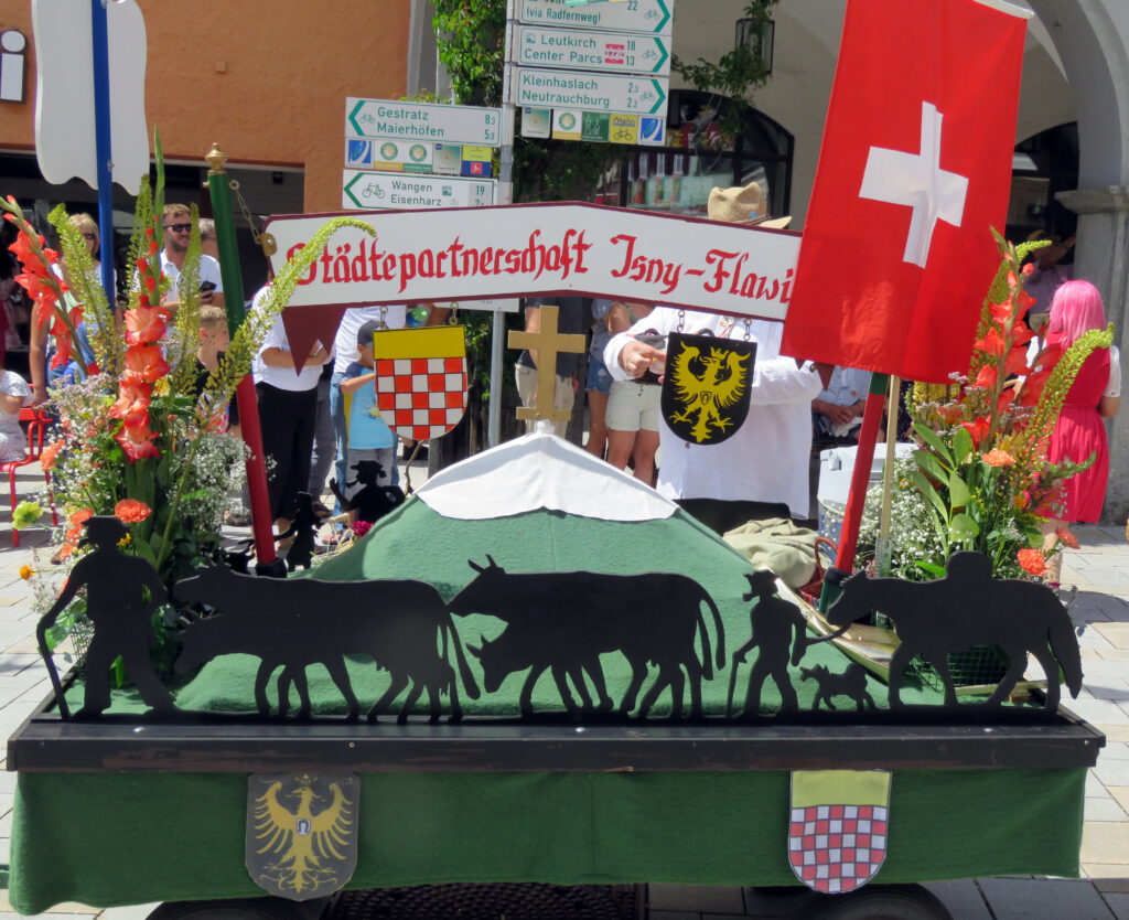 Seit 1620 gibt es das Isnyer Kinder- und Heimatfest – sicherlich unterbrochen in Kriegs- und Notzeiten. Eine stolze Tradition, einer alten Reichsstadt würdig. Handel und Wandel, Leben und – ja, auch Sterben – schienen in dem prächtigen farbenfrohen Umzug auf. So war unter der Überschrift „Heimsuchungen“ ein historischer Leichenwagen zu sehen, der an Pestzeiten gemahnte. Natürlich überwogen die lebensfrohen, die farbenfrohen Motive bei weitem, strahlten ihre Darsteller um die Wette. Und das bei Kaiserwetter!