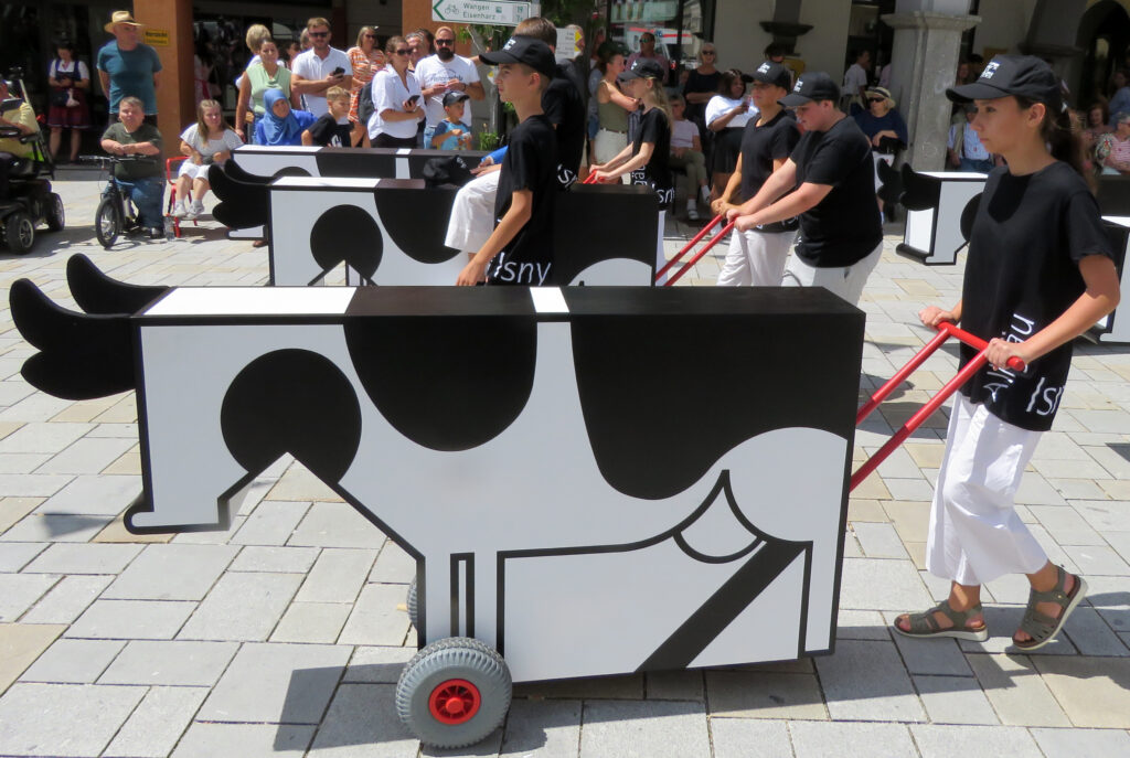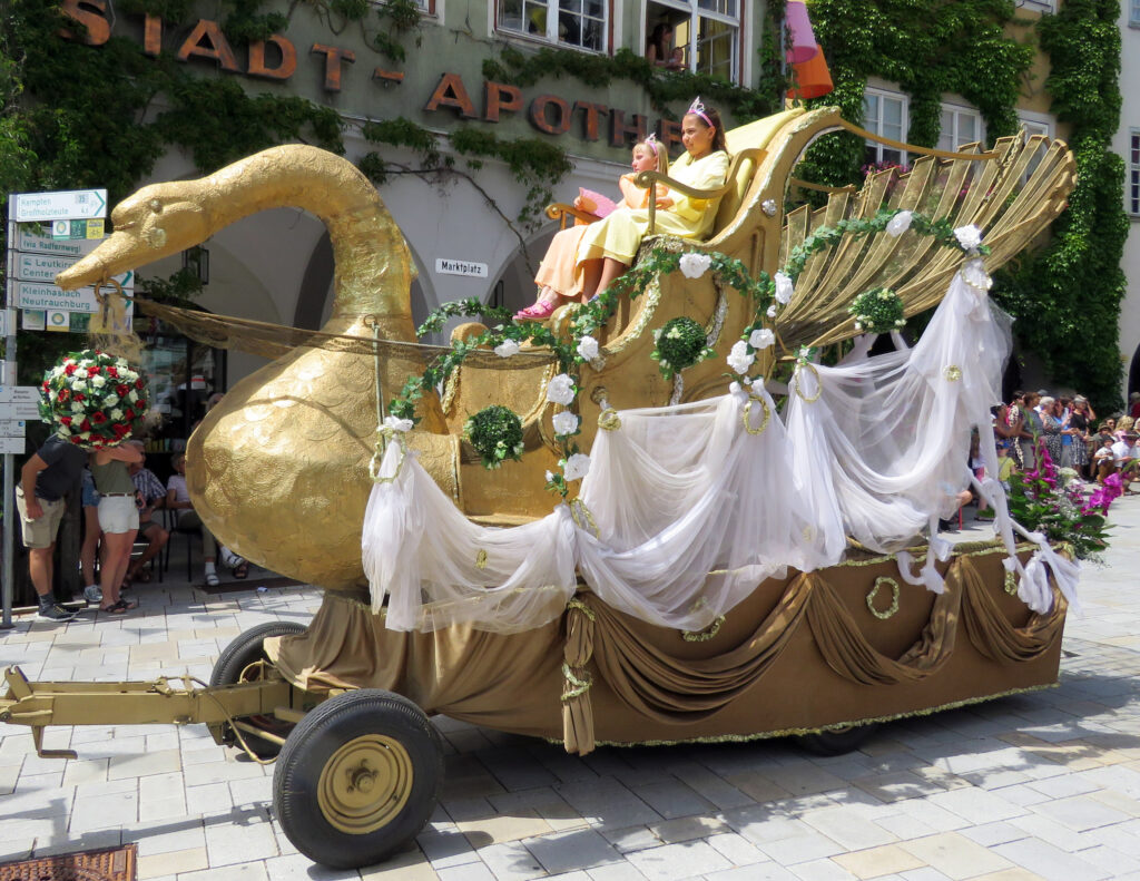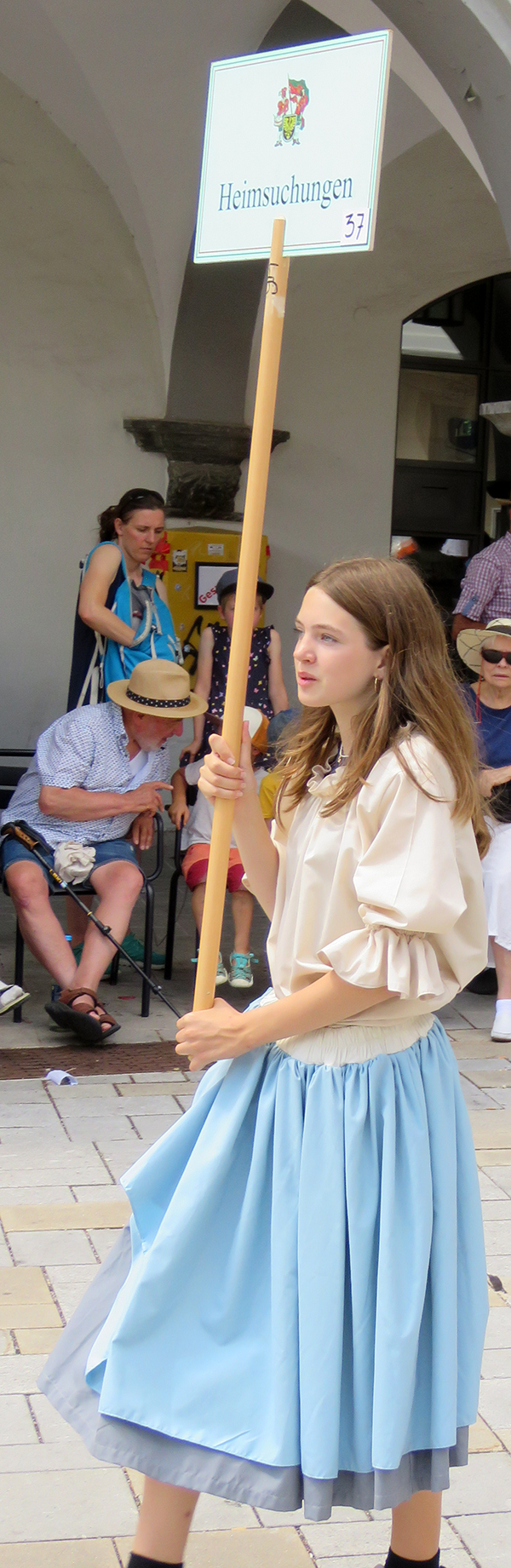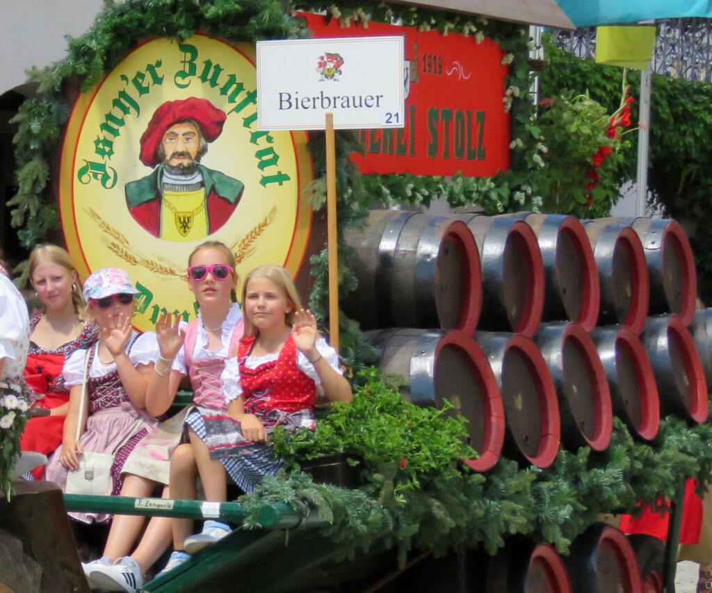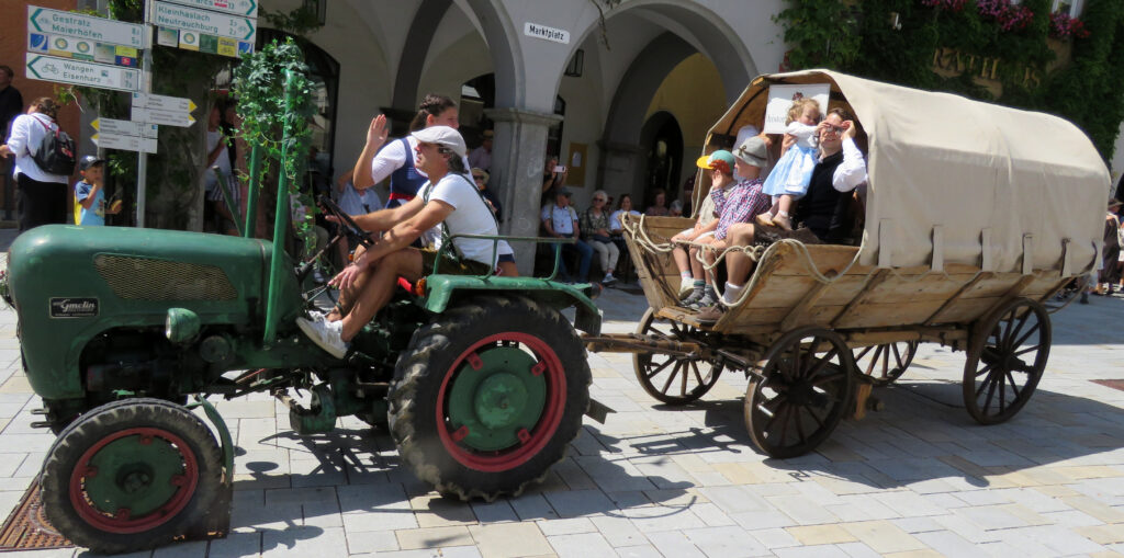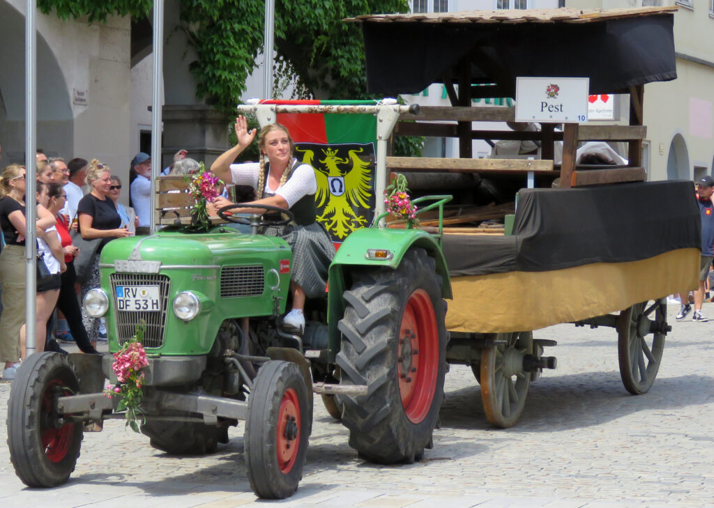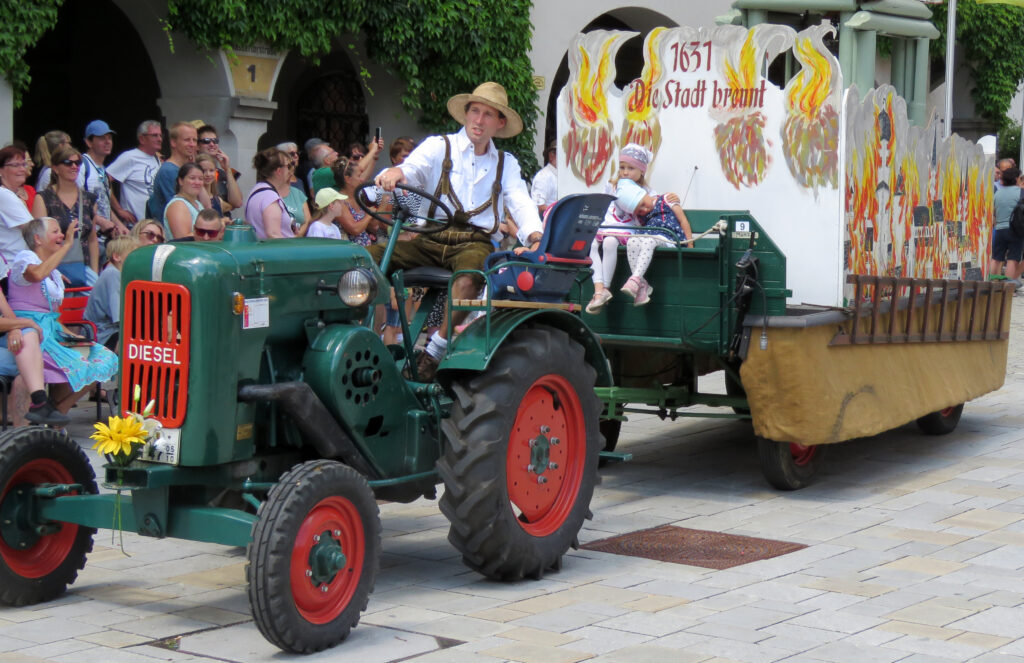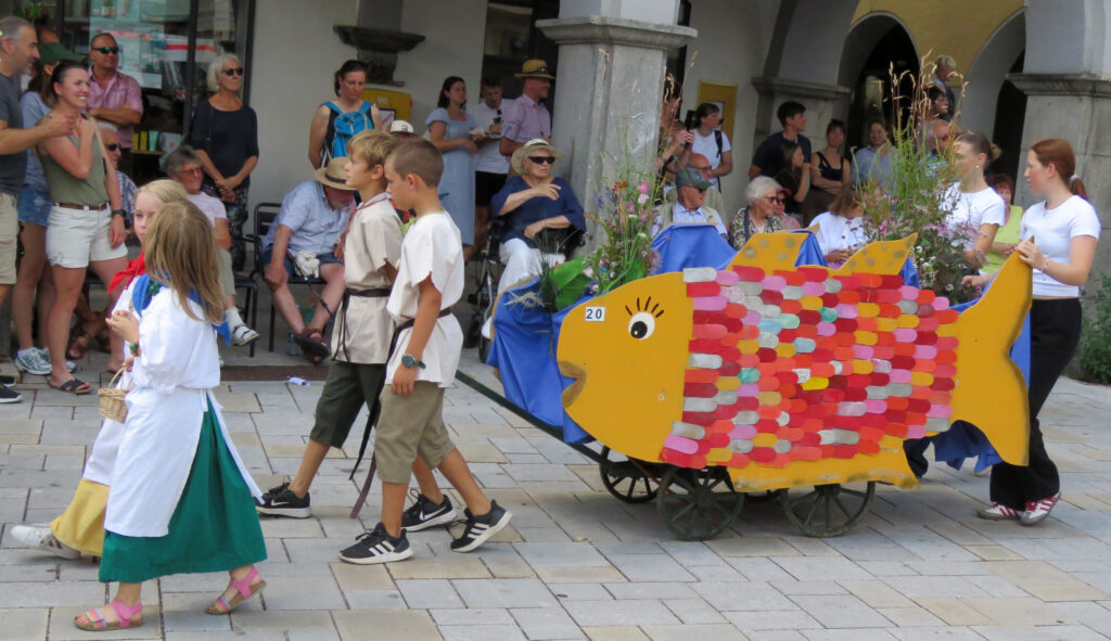 Seit 1620 gibt es das Isnyer Kinder- und Heimatfest – sicherlich unterbrochen in Kriegs- und Notzeiten. Eine stolze Tradition, einer alten Reichsstadt würdig. Handel und Wandel, Leben und – ja, auch Sterben – schienen in dem prächtigen farbenfrohen Umzug auf. So war unter der Überschrift „Heimsuchungen“ ein historischer Leichenwagen zu sehen, der an Pestzeiten gemahnte. Natürlich überwogen die lebensfrohen, die farbenfrohen Motive bei weitem, strahlten ihre Darsteller um die Wette. Und das bei Kaiserwetter!