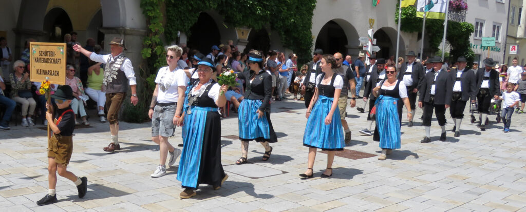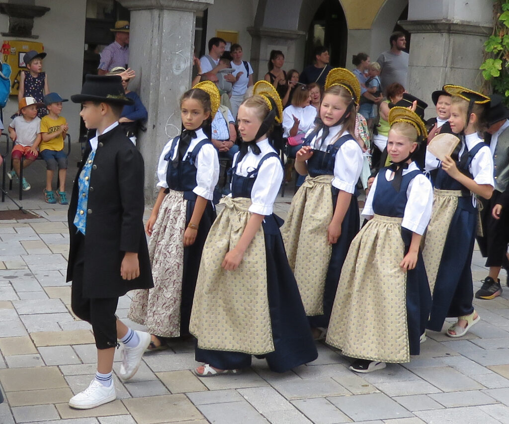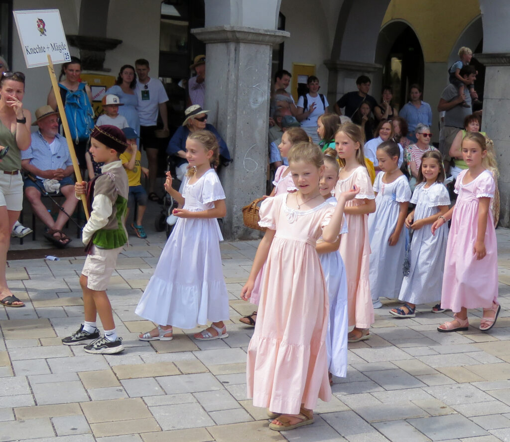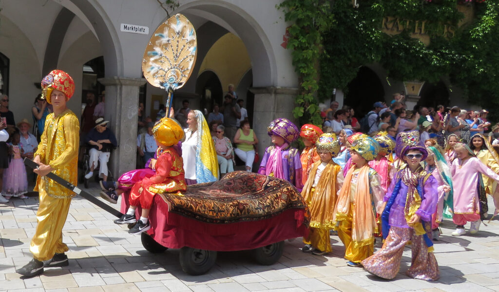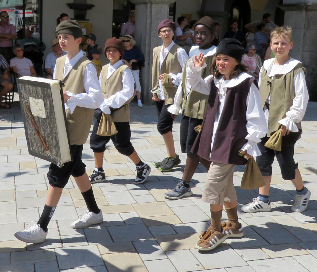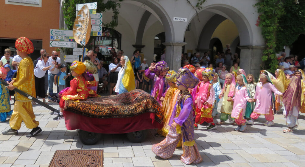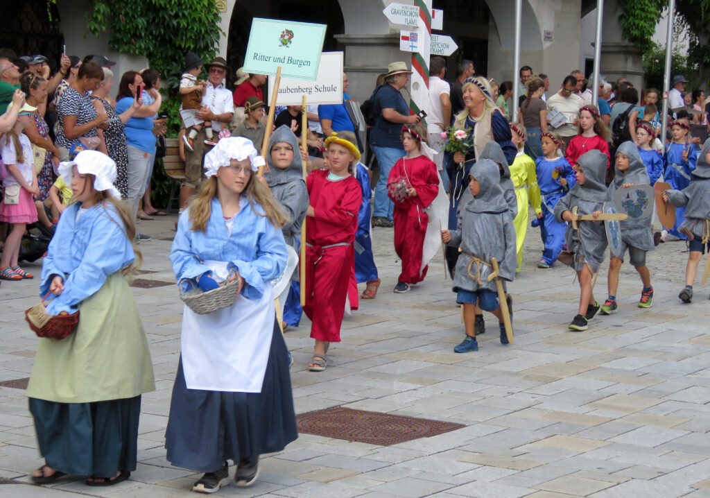 In der nachfolgenden Bildergalerie hat der noch nicht sehr ortskundige Reporter viele Bilder untergebracht. Hinweisen möchten wir noch auf bemerkenswerte Zahlen, die Eva-Maria Schwärzler, die Vorsitzende der Kinderfestkommission, beim Empfang vor dem um 14.00 Uhr mit kräftigen Böllerschüssen eröffneten Umzug in ihrer Dankesrede mitteilte: „Im Frühjahr ist unser Fundus mit ca. 2000 Kostümen, über 50 Kleiderständern, mehreren hundert Umzugskartons mit Zubehör und Accessoires, ca. 25 laufende Meter Regale, Werkstatt, Nähmaschinen, Bügelbretter, Arbeitstische und, und, und in neue und größere Räumlichkeiten umgezogen.“ In diese Requisitenfülle nicht eingerechnet ist die Ausstattung der auswärtigen Gruppen.