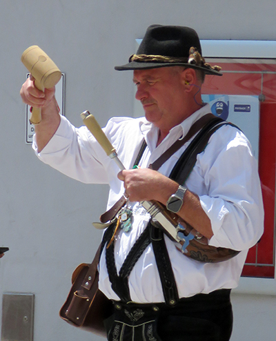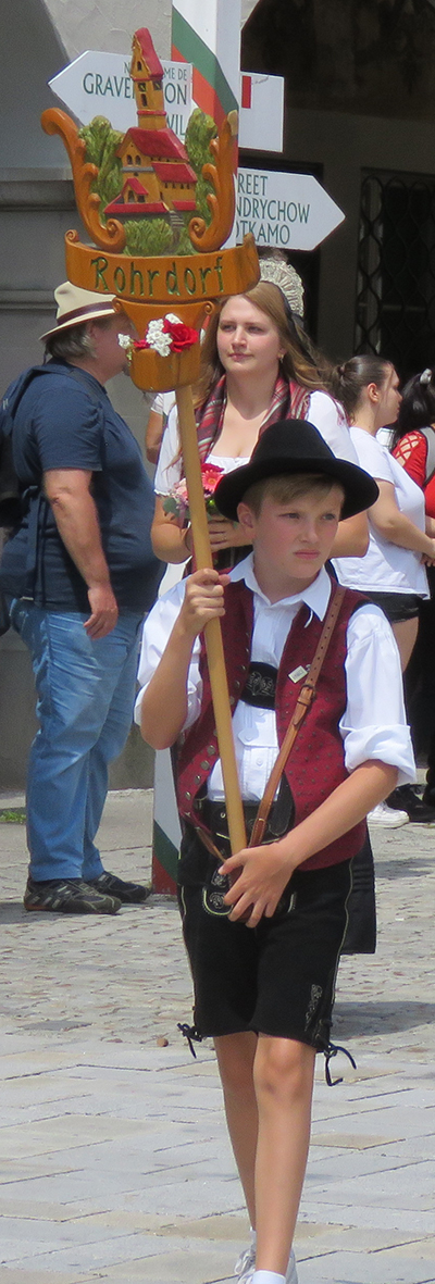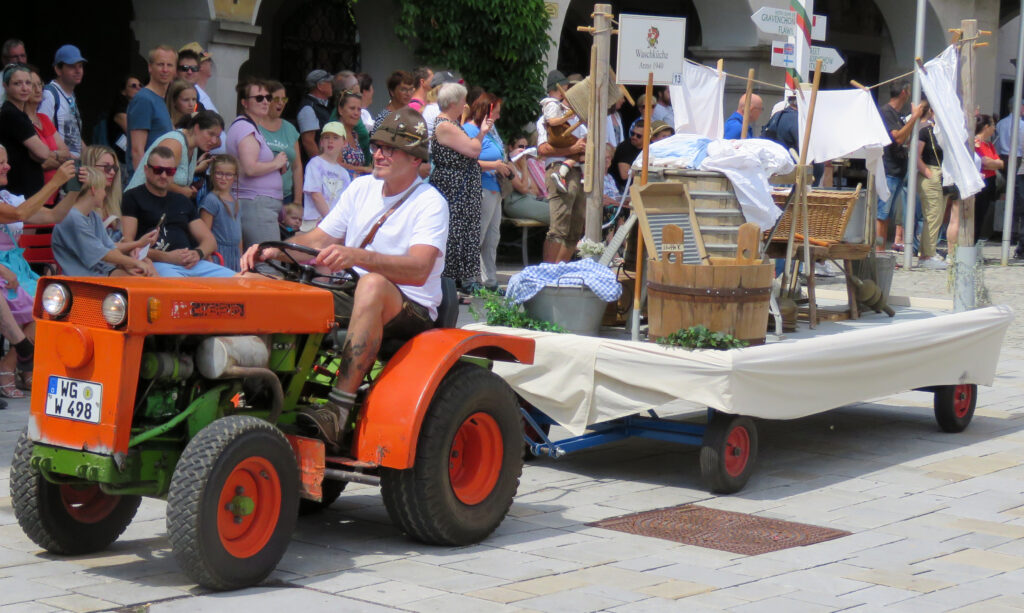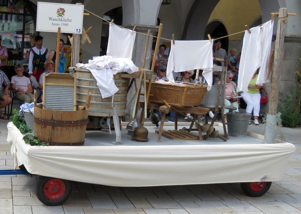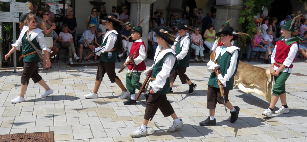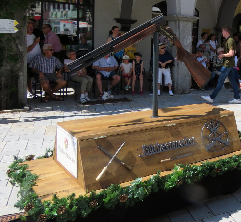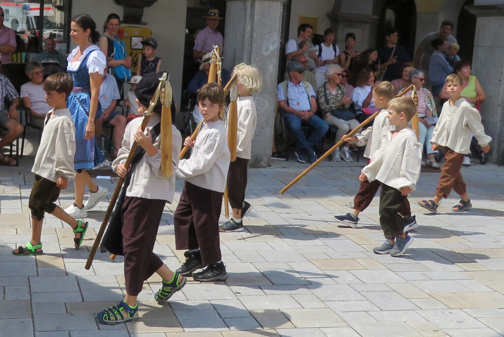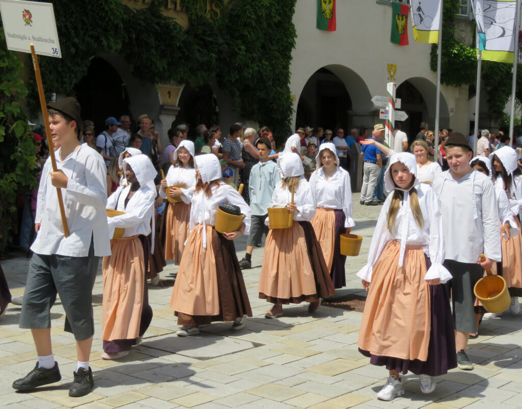 In der nachfolgenden Bildergalerie hat der noch nicht sehr ortskundige Reporter viele Bilder untergebracht. Hinweisen möchten wir noch auf bemerkenswerte Zahlen, die Eva-Maria Schwärzler, die Vorsitzende der Kinderfestkommission, beim Empfang vor dem um 14.00 Uhr mit kräftigen Böllerschüssen eröffneten Umzug in ihrer Dankesrede mitteilte: „Im Frühjahr ist unser Fundus mit ca. 2000 Kostümen, über 50 Kleiderständern, mehreren hundert Umzugskartons mit Zubehör und Accessoires, ca. 25 laufende Meter Regale, Werkstatt, Nähmaschinen, Bügelbretter, Arbeitstische und, und, und in neue und größere Räumlichkeiten umgezogen.“ In diese Requisitenfülle nicht eingerechnet ist die Ausstattung der auswärtigen Gruppen.