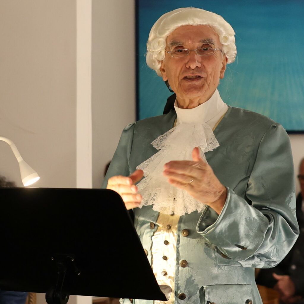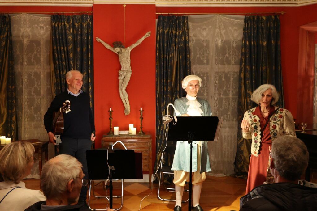 Kammerdiener Berthold in historischem Kostüm führt durch die prachtvollen Räume des Isnyer Schlosses. Mit Erklärungen und Liedern und seinem Geigenspiel vermittelt er als musikalischer Kammerdiener die Historie des früheren Klosters und jetzigen Schlosses Isny. In der Kapelle wird es ganz andächtig, als das Marienlob (Magnificat) und das Salve Regina erklingen. Zusätzlich hat Berthold Büchele hier das Lied vom großen Isnyer Brand gesungen. Begleitet wird er von dem einfühlsamen Gitarristen Ernst Greinacher. Die rund fünfzig Gäste genießen zum Abschluss ein Loblied auf den Wein und dann eine feinen Pinot Noir.