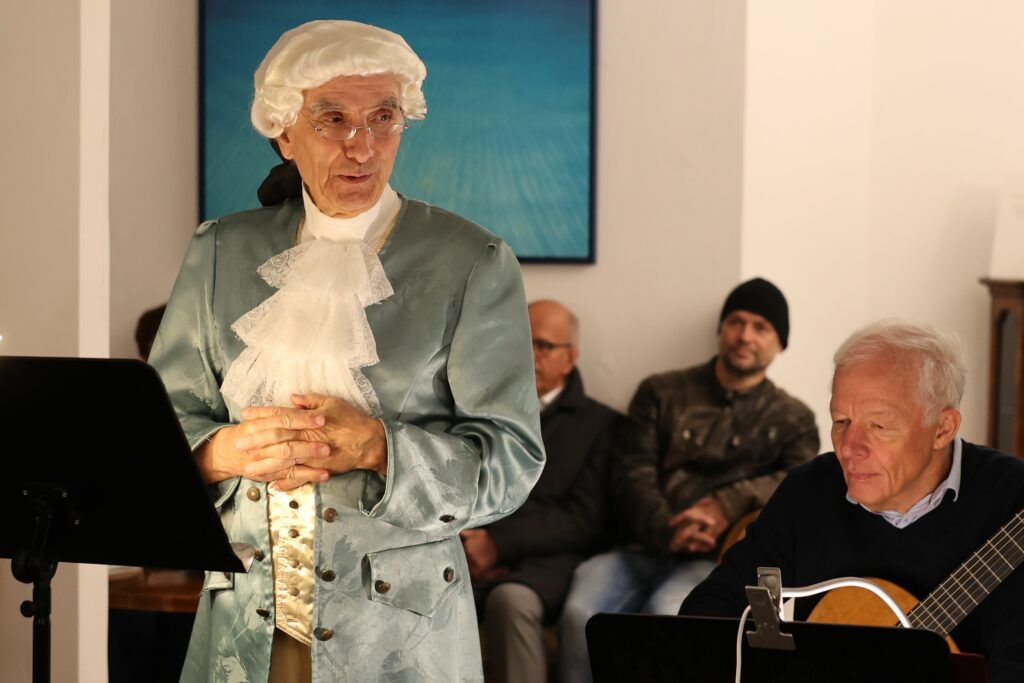 Isny – Am 29. März führte Berthold Büchele, begleitet vom Gitarristen Ernst Greinacher, durchs Isnyer Schloss. Man ging durch verschiedene Räume und das Duo Büchele / Greinacher bot mit Texten, Liedern und Instrumentalstücken Einblicke in die Geschichte des ehemaligen Klosters beziehungsweise des Schlosses. Eingeladen hatte der Förderverein „Roter Salon“, der sich um für Kunst & Kultur im Schloss Isny kümmert. Unser Reporter Hans Reichert war der Schlossführung der besonderen Art dabei.