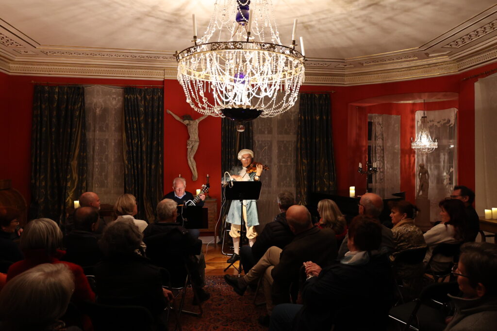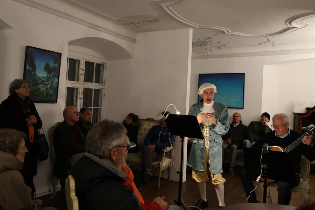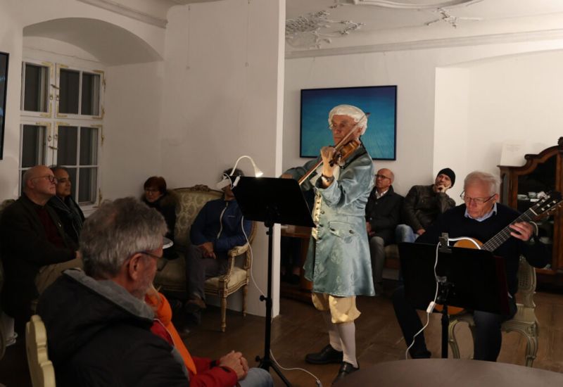 Kammerdiener Berthold in historischem Kostüm führt durch die prachtvollen Räume des Isnyer Schlosses. Mit Erklärungen und Liedern und seinem Geigenspiel vermittelt er als musikalischer Kammerdiener die Historie des früheren Klosters und jetzigen Schlosses Isny. In der Kapelle wird es ganz andächtig, als das Marienlob (Magnificat) und das Salve Regina erklingen. Zusätzlich hat Berthold Büchele hier das Lied vom großen Isnyer Brand gesungen. Begleitet wird er von dem einfühlsamen Gitarristen Ernst Greinacher. Die rund fünfzig Gäste genießen zum Abschluss ein Loblied auf den Wein und dann eine feinen Pinot Noir.