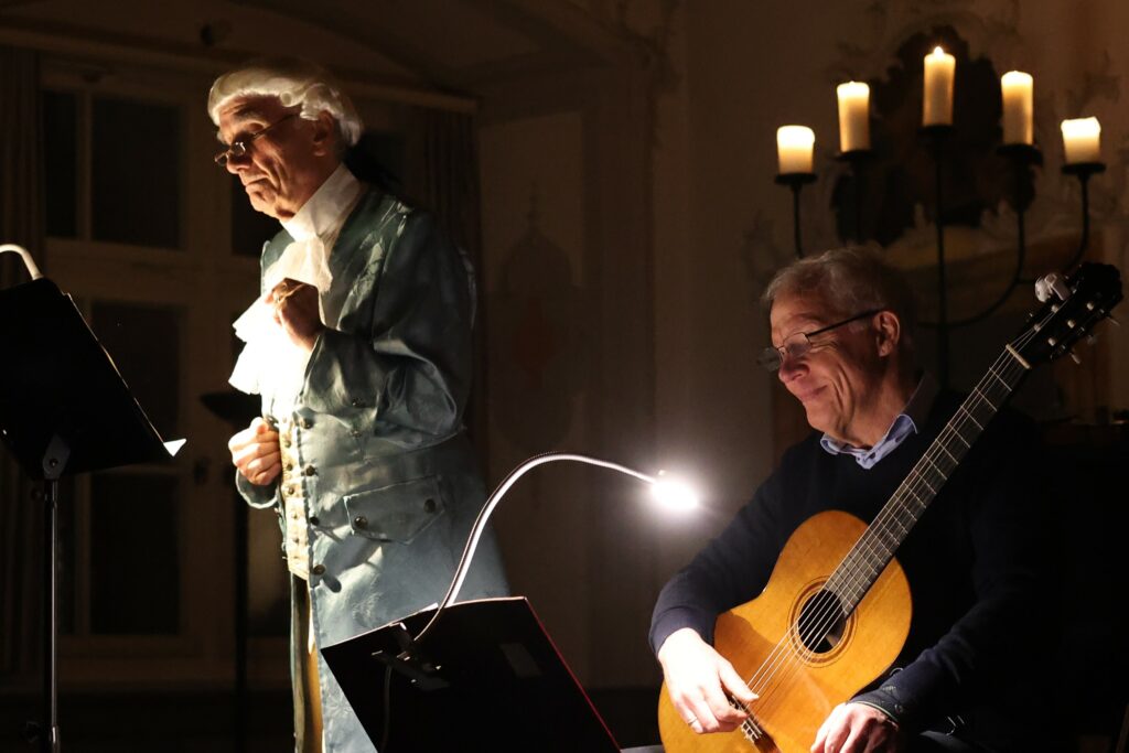 Isny – Am 29. März führte Berthold Büchele, begleitet vom Gitarristen Ernst Greinacher, durchs Isnyer Schloss. Man ging durch verschiedene Räume und das Duo Büchele / Greinacher bot mit Texten, Liedern und Instrumentalstücken Einblicke in die Geschichte des ehemaligen Klosters beziehungsweise des Schlosses. Eingeladen hatte der Förderverein „Roter Salon“, der sich um für Kunst & Kultur im Schloss Isny kümmert. Unser Reporter Hans Reichert war der Schlossführung der besonderen Art dabei.