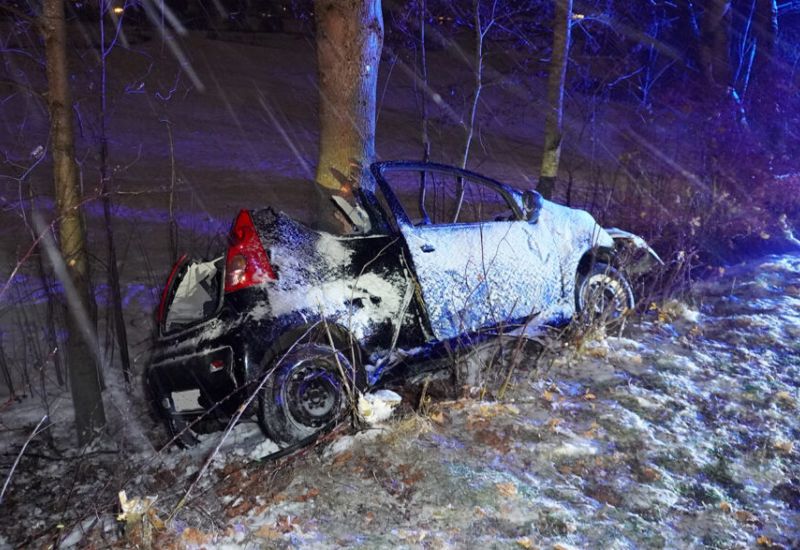 Isny – Am Freitagabend (21.11.) gegen 20.00 Uhr kam es in Isny auf der Kemptener Straße, Höhe Wilhelm-Nagel-Weg, zu einem folgenschweren Verkehrsunfall: Der 33-jährige Fahrer eines Peugeot 107 kam – mutmaßlich aufgrund winterlicher Straßenverhältnisse und daran nicht angepasster Geschwindigkeit – ins Rutschen.