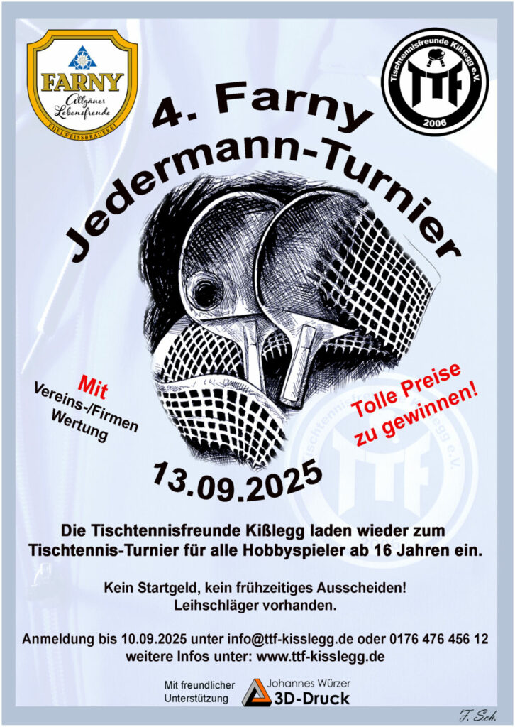Kißlegg – Die Tischtennisfreunde Kißlegg laden am 13. September bereits zum 4. Farny-Jedermann-Turnier in die Schulsporthalle Kißlegg an der Realschule ein. Alle Strandbadspieler, Garagenzocker, Bälleschieber sind herzlich eingeladen, sich im sportlichen Rahmen mit Familienmitgliedern und Vereinskameraden am Tischtennistisch zu messen.