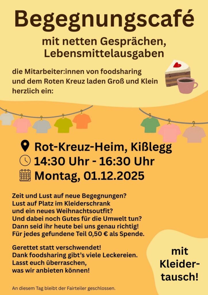 Kisslegg – Am Samstag, 1. Dezember, findet von 14.30 bis 16.30 das Begegnungscafé statt mit Kleidertausch für Groß und Klein, weihnachtlichem Bastelangebot und Kuscheltiertausch für Kinder, netten Gesprächen und Lebensmittelausgaben.