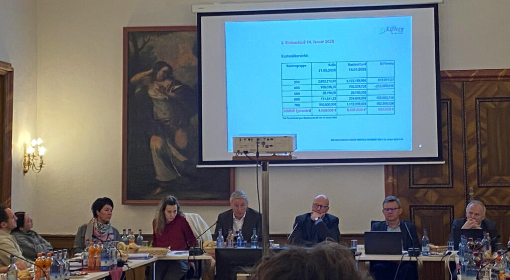 In der Sitzung am 28. Januar benannte Architekt Stottele nun sehr eingehend und detailliert die Ursachen für die höheren Beträge. Kämmerer Roland Kant und Bauamtsleiter Manfred Rommel erläuterten dann, wie durch Umschichtungen im Haushalt der Kostenrahmen eingehalten werden könne. Außerdem durch weiteres Geld von außen. Bürgermeister Dieter Krattenmacher wies auf solche Zuschüsse – etwa vom Land – hin und zeigte sich zuversichtlich, „dass wir die nächsten vier Wochen Klartext” (zu diesen Zuwendungen von außen) haben“. Dabei helfe Kißlegg auch, was der Bund voraussichtlich Geld aus seinem „Sondervermögen” in Richtung Kißlegg fließen lassen wolle.