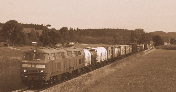 Diesellok V160 bei Bärenweiler 1964 (im Hintergrund ist der Zwiebelturm der Spitalkapelle erkennbar).