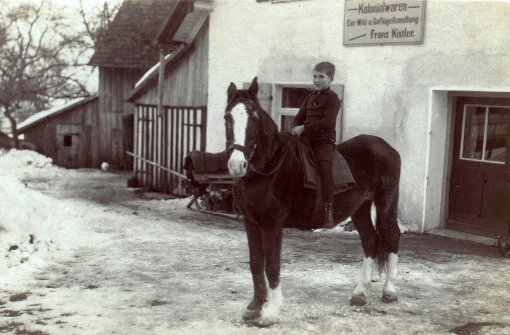 Der Sohn des Wiggenreuter Kolonialwarenhändlers: Franz Kistler junior. Ca. 1948. Damals hatte Kistlers Handlung noch keinen VW-Transporter. Eingespannt wurde dieses Pferd.