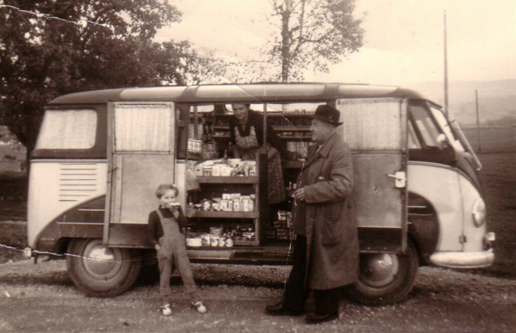 Eine weitere Institution in Wiggenreute war der Kolonialwarenhändler Franz Kistler. Neben seinem Ladengeschäft war er als fahrender Händler in der ganzen Umgebung unterwegs und bot auf den Höfen seine Waren an. Anfangs noch mit dem Pferdefuhrwerk, ab 1956 mit seinem modernen VW T1 Bus, der mit Regalen voller Lebensmittel für den täglichen Bedarf bestückt war. Er war überall gern gesehen und beliebt. Konnte man von ihm doch die neuesten Nachrichten aus der ganzen Umgebung erfahren. Bis 1967 war Franz Kistler mit seinem Bus unterwegs. Dann wurde der Laden geschlossen und die Wiggenreuter mussten in die umliegende Orte um einzukaufen.