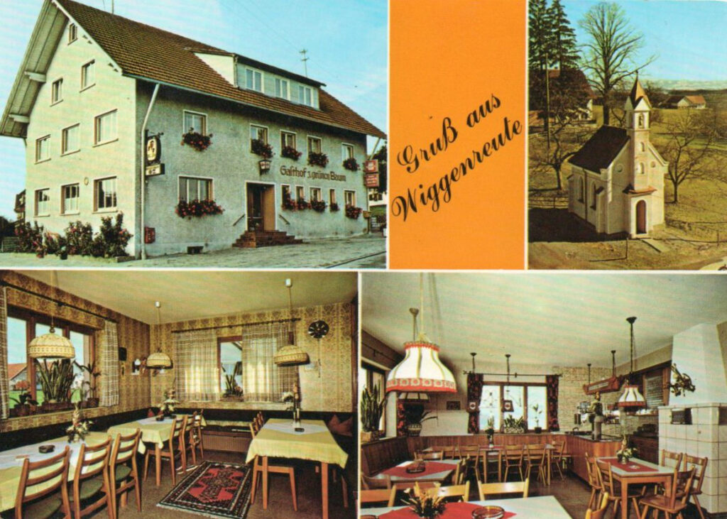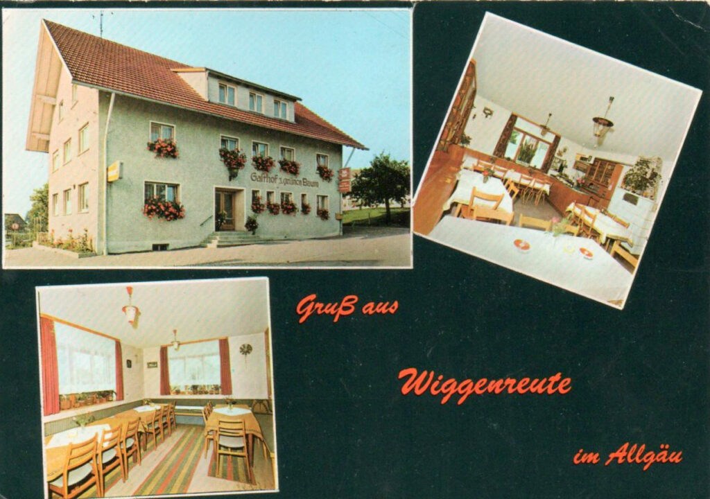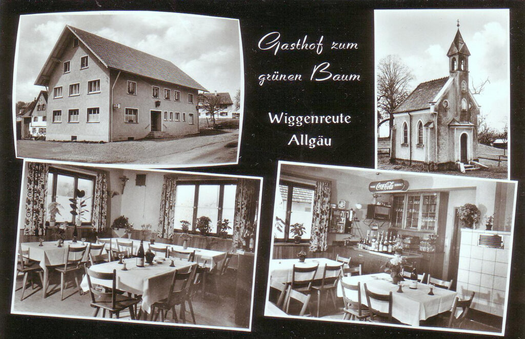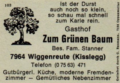 Das Hauptaugenmerk des Kalenderblatts liegt auf der Gastwirtschaft „Zum Grünen Baum“, die ab 1903 von den Wirtsleuten Haaga im Nebenerwerb (man hatte ja auch noch eine Landwirtschaft zu versorgen) betrieben wurde und 1954 von Karl Stanner und seiner Ehefrau übernommen wurde. Karl Stanner war gebürtig aus Wallmusried, seine Eltern hatten dort eine kleine Kolonialwarenhandlung bei der Bahnhaltestelle. Auch bei Stanners war es so, dass der Ehemann tagsüber arbeiten war (er war lange Jahre Lkw-Fahrer beim Betonwerk Rinninger) und seine Ehefrau die Wirtschaft umtrieb. Abends und am Wochenende war Karl Stanner dann Wirt mit Leib und Seele, der aber auch die Autorität hatte, wenn es die Gäste mal übertrieben und sich prügeln wollten, kurzerhand den Hagenschwanz (Ochsenziemer) hinter der Theke hervorzuholen und damit wieder für Ordnung zu sorgen. Dass es dort gutes und reichliches Essen gab, sah man dem Wirt mit Zeit auch an und man nannte ihn liebevoll den „Ranzenwirt“. Fremdenzimmer wurden auch angeboten, 1970 wurden die Zimmer aufwändig renoviert. Die Gaststätte war beliebt und immer gut besucht, an Sonn- und Feiertage fanden viele Familienfeiern dort statt. Außerdem konnte man dort weitrum die besten Grillhähnchen bekommen. Die konnte man auch telefonisch vorbestellen und abholen. Das Ritual war jedes Mal das gleiche. Als Abholzeit wurde 19.30 Uhr vereinbart, wenn man aber um diese Zeit hinkam, hieß es stets: „Sind noit ganz fertig, sitz na und trink no a Halbe.“ Wenn die Halbe leer war, waren dann auch die Hähnchen fertig. Die Gaststätte wurde bis 2011 betrieben, später war es nur noch eine Pension mit Fremdenzimmern. Die Wirtsleute waren da auch schon beide über 80 Jahre alt. Karl Stanner starb 2016 mit 86 Jahren, seine Ehefrau Maria 2021 mit 87 Jahren.