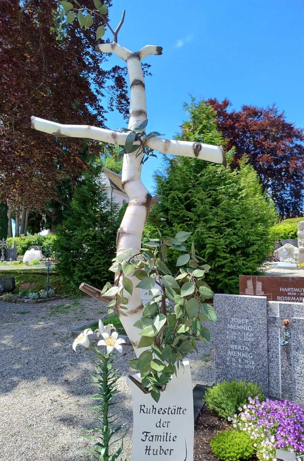 Im Zentrum der Grabstätte ein ungewöhnliches Birkenkreuz